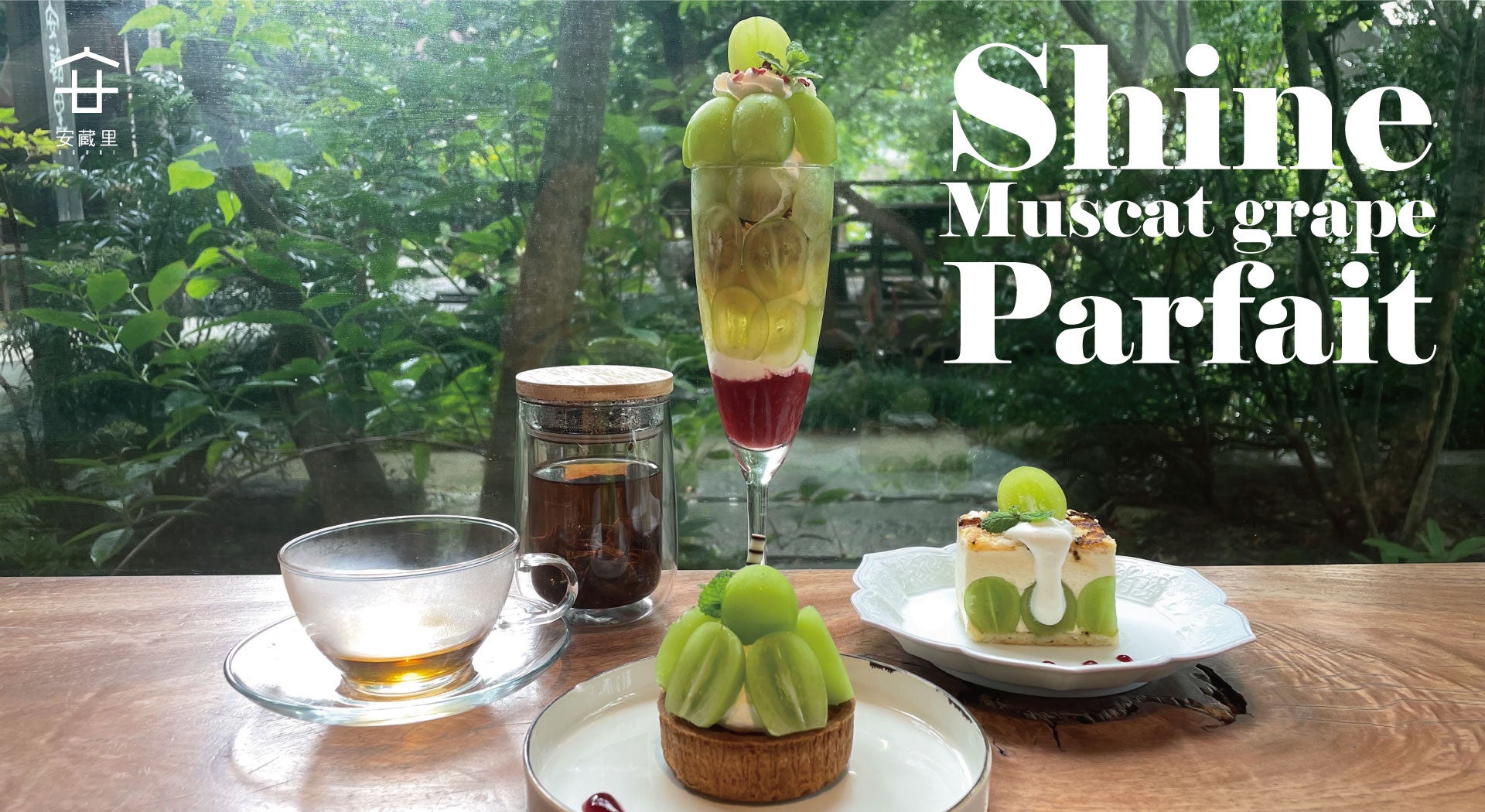 シャインマスカットのスイーツはタルト以外にも、シャインマスカットのパフェ(中央後ろ)とシャインマスカットのスリー(右)もご用意しています!