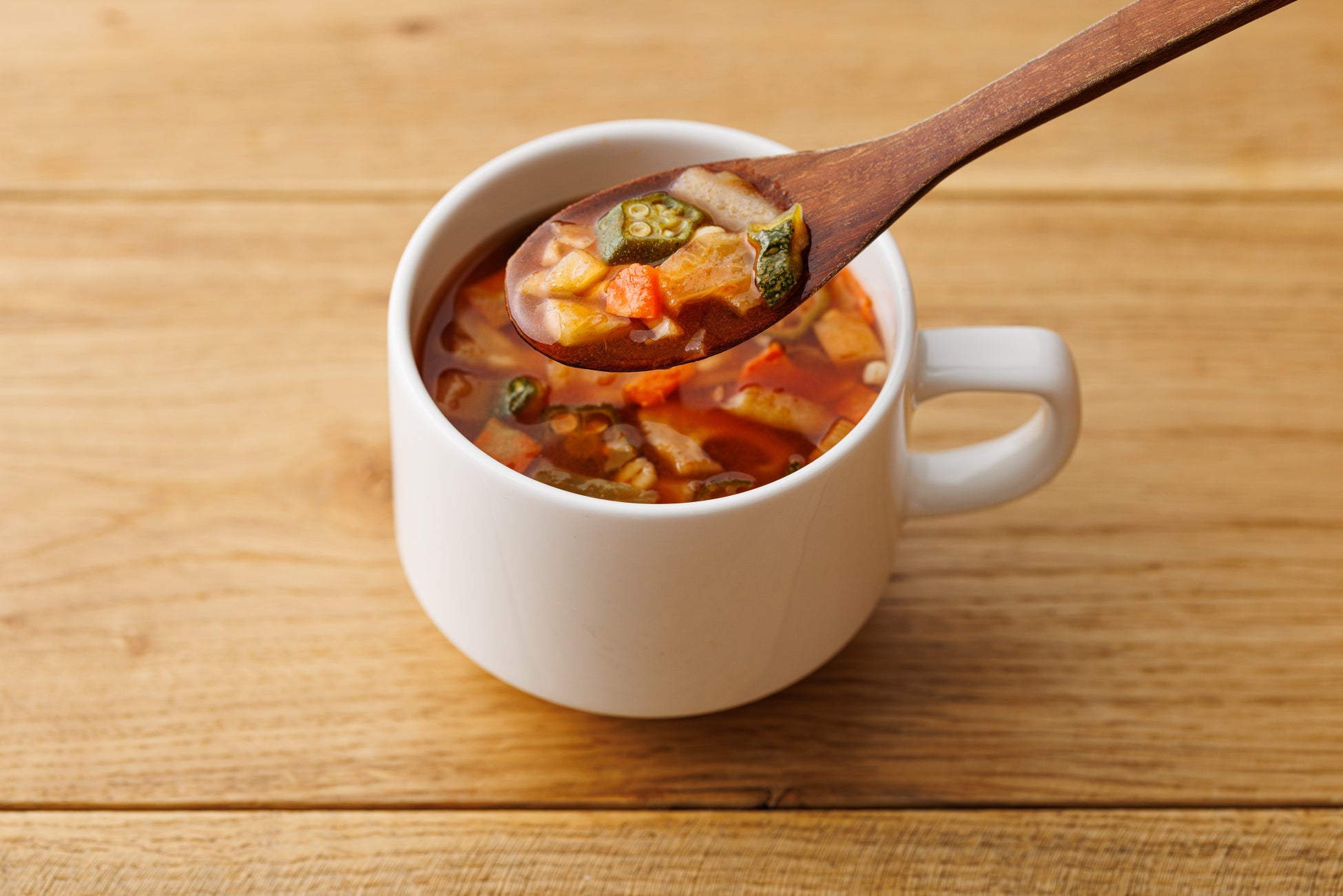 ごぼう、ズッキーニ、蓮根、大根、オクラなど多様な野菜と押し麦をバランス良く組み合わせたベジタリアンスープ。野菜のシャキシャキとした食感とトマトの甘酸っぱいおいしさが口いっぱいに広がります。
