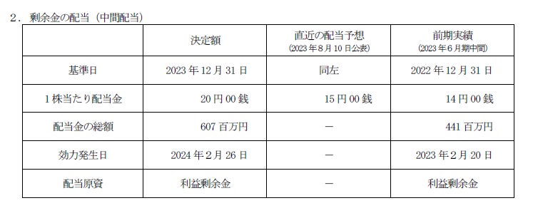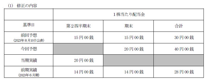 1.のとおり2024年6月期の通期連結業績予想を上方修正したことに合わせて、2024年6月期の年間配当予想額を期初予想の1株当たり30円から10円増配し、1株当たり40円に修正いたしました。これにより、2024年6月期の中間配当について、1株当たり年間配当予想額の半分となる1株当たり20円とすることを決議したことに伴い、期末配当予想についても20円に修正いたしました。