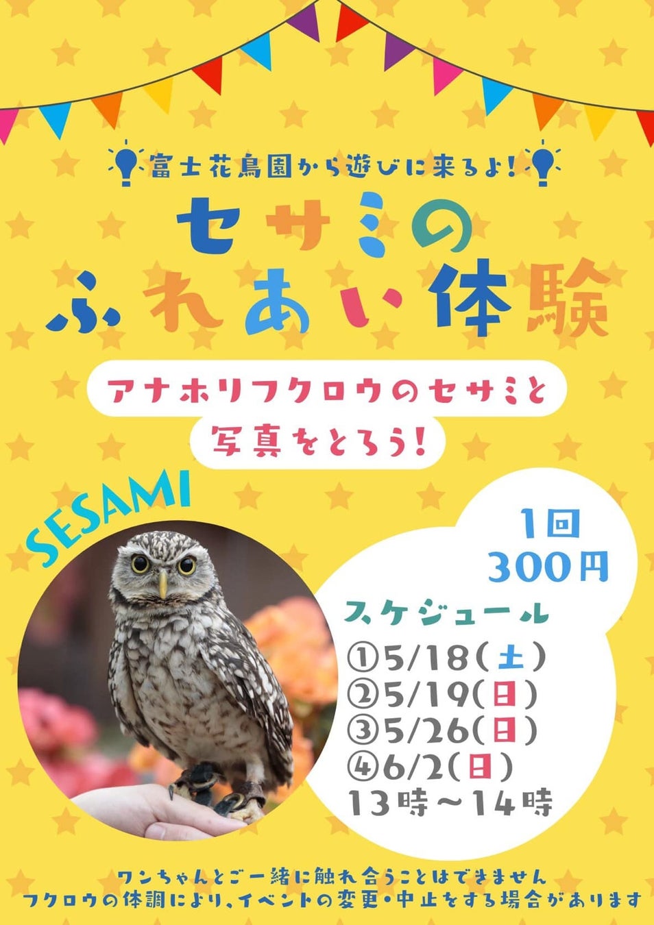 5月19日日曜日、富士花鳥園からアナホリフクロウ「セサミ」がやってきます。抹茶かき氷専門店「忍者茶房 茶助」も開店で、とってもお得なダブルイベントです。人懐っこくて可愛いセサミを腕に乗せて記念撮影をした後は、掛川抹茶を使用した濃厚な抹茶かき氷を食べて、心もお腹も癒され見てはいかがでしょう。