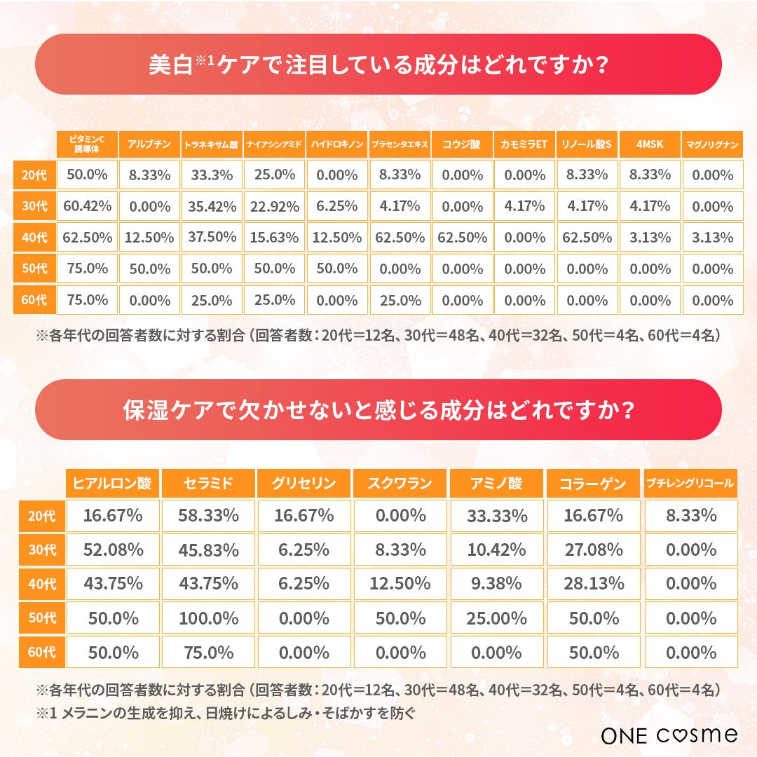中でも、ビタミンC誘導体やセラミドなどの定番成分に注目する声が多く、肌状態の変化にあわせて「透明感ケア」と「保湿強化」を両立させたいというニーズが見られました。