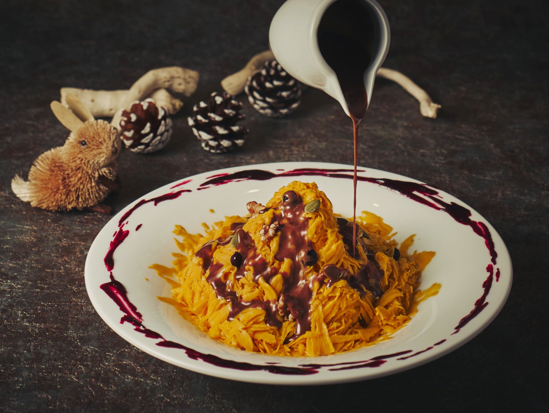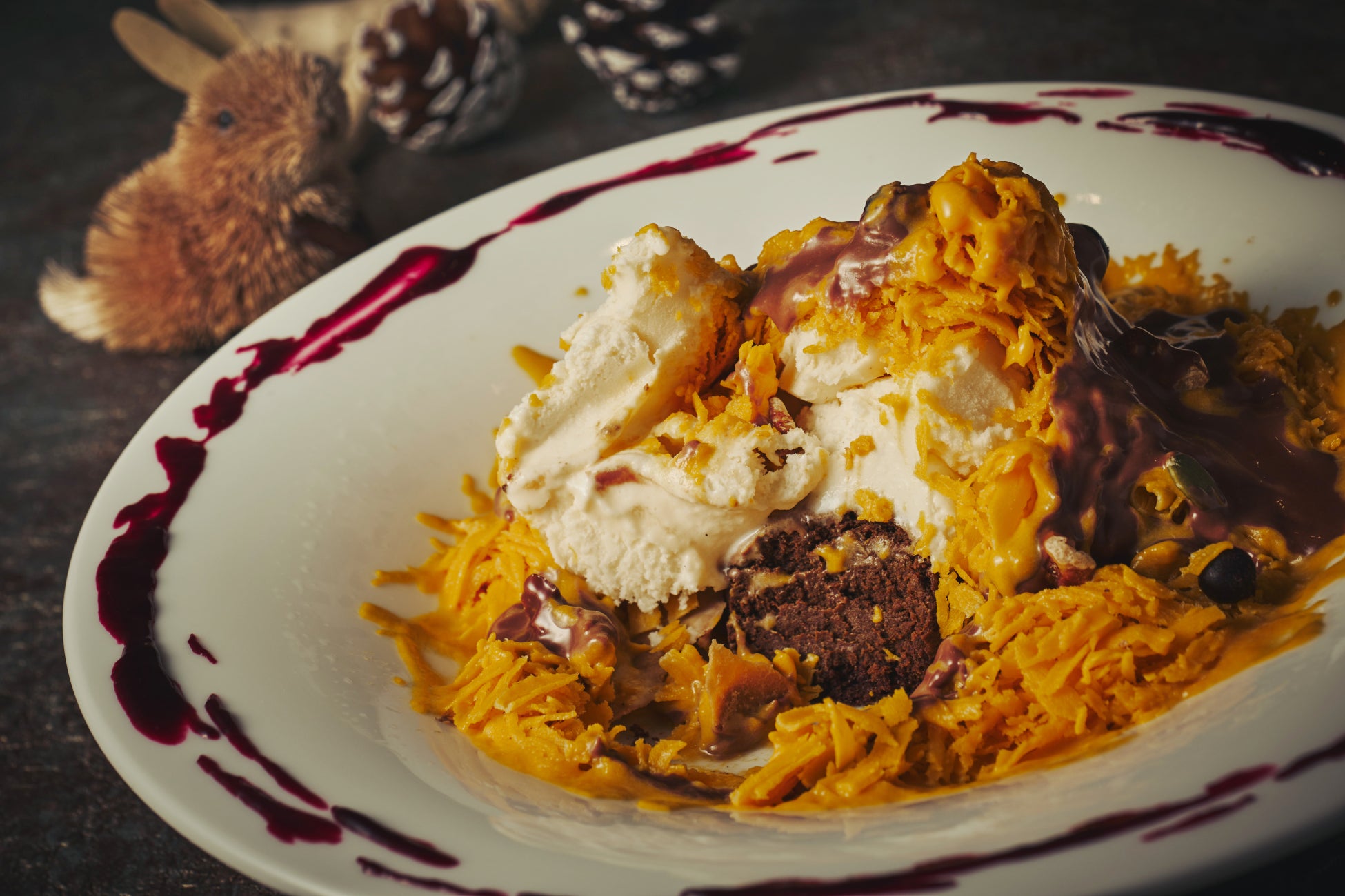 詳細:イタリア語で「温かい・冷たい」を意味する「カルド フレッド」。その名の通り温かい素材と冷たい素材を組み合わせる「chaud-froid(ショー・フロワ)」タイプのドルチェです。かぼちゃペースト入りの温かいチョコスフレに冷たいバニラアイスをトッピング。仕上げに国産最高峰とも言われる、北海道産「栗マロンかぼちゃ」を使用した濃厚なかき氷をたっぷり重ね、さらに隠し味として国産ほおずきコンポートのかき氷も忍ばせた大変贅沢な一品です。別添えの温かいジャンドゥーヤソースをかけてお召し上がりいただくと、一層芳醇な香りが口の中に広がります。