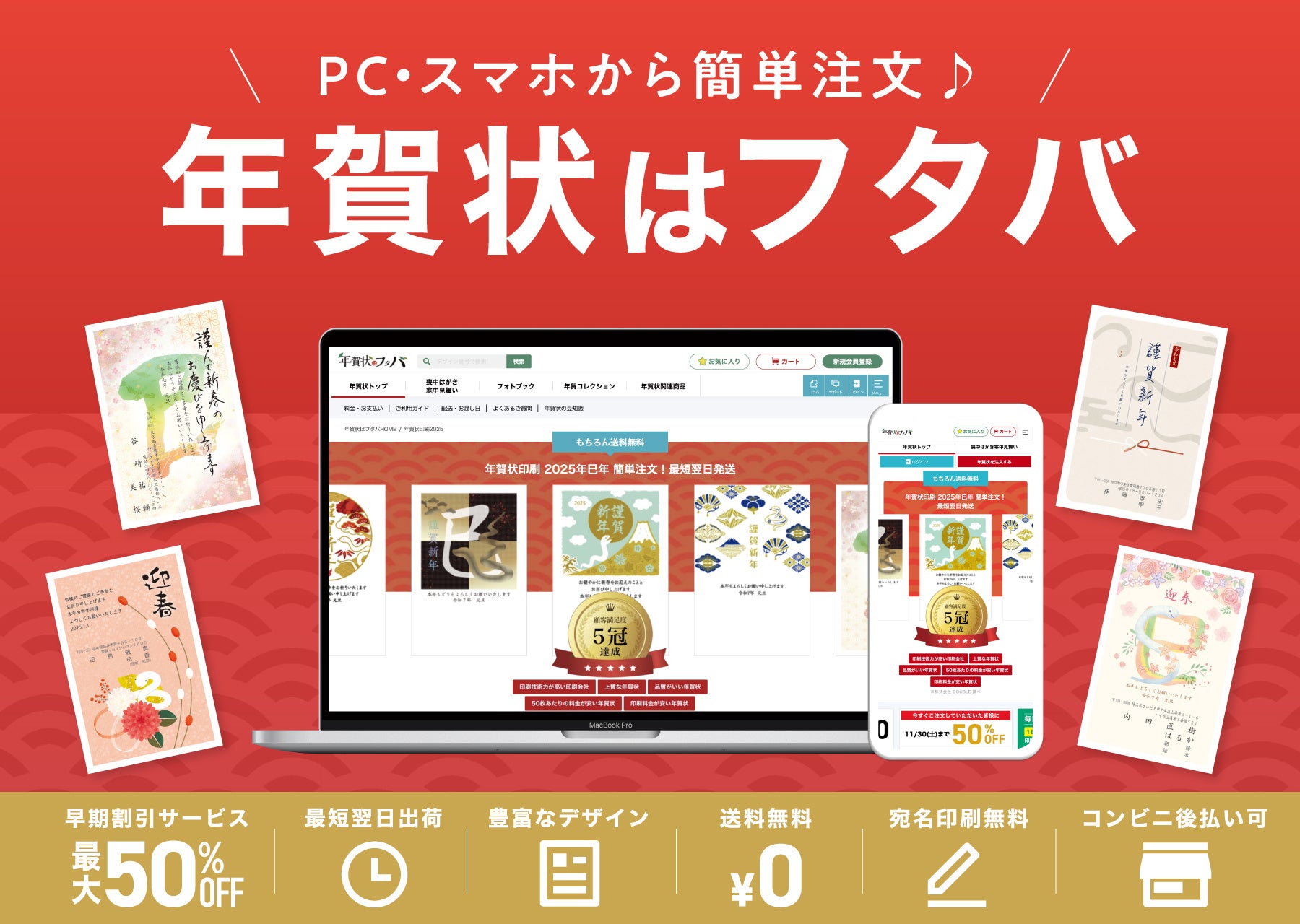 また、PC・スマホから簡単に注文ができる「年賀状はフタバ」では、年賀状印刷サービスと合わせてお得にご注文いただけます。
