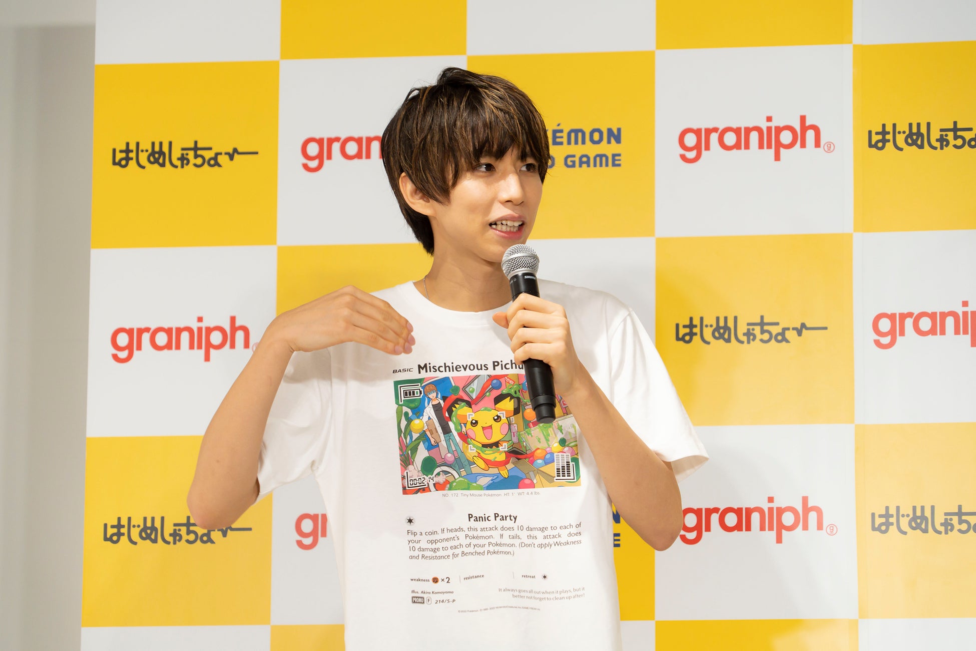 「特別カード中央にいる、ピチューの表情。このいたずらっぽい表情にはすごくこだわりました。いたずら好きをコンセプトに、キュンとする特別なポケモンカードです。また、今回のポケモンカードには「どたばたパーティー」というワザがあり、他のポケモンカードとも一緒に活躍する可能性があると思います。また今回のアイテムは遊び心満載なので、ポケモンカードゲームが好きな方はもちろん、さりげないファッションアイテムとして取り入れたい方にもおすすめします」「今日、このP-Lab.プロジェクトを発表出来て本当に嬉しいです。実際に商品を着用してワクワクしています」と熱い思いを述べていただきました。さらに、「普段から遊んでいるポケモンカードゲームと、普段からTシャツを愛用しているグラニフとご一緒出来て、本当に嬉しく思っています。動画クリエイターって、夢があるなと感じています。大変ですけどね。」と、笑顔でお話しいただきました。