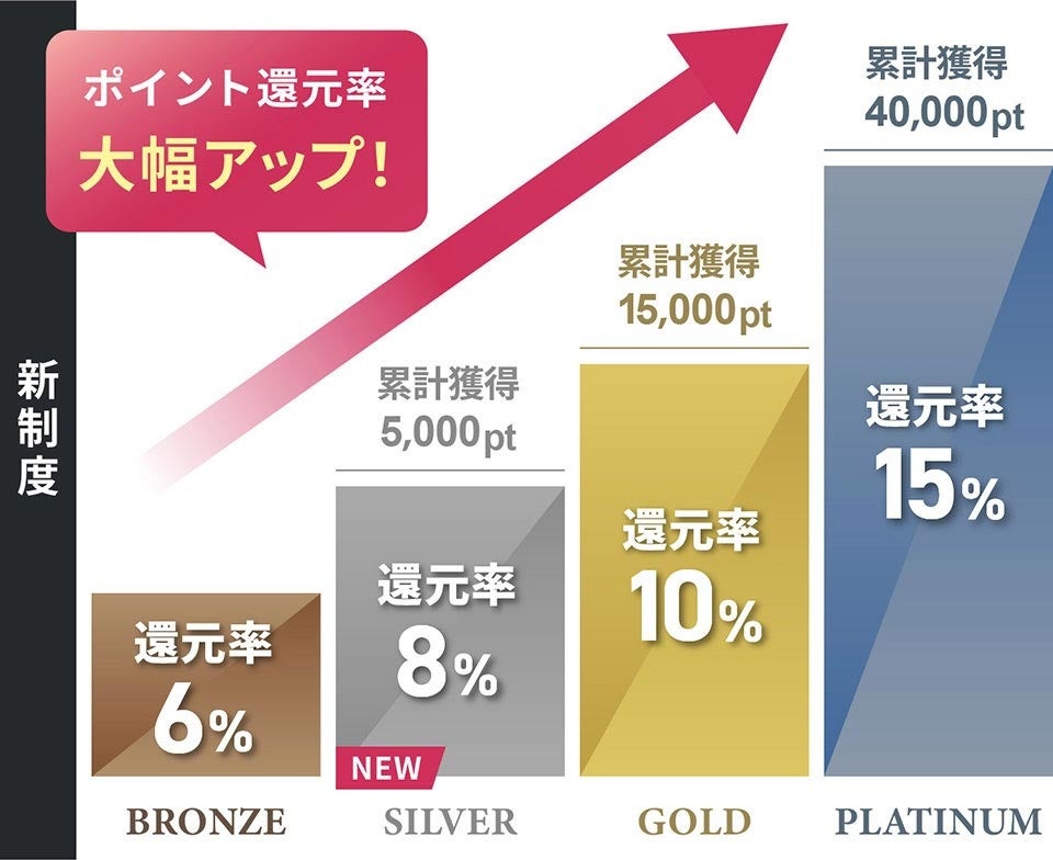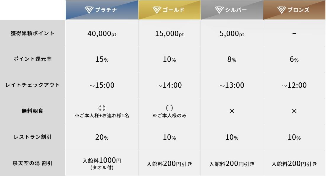入会金・年会費無料のCLUB VILLA FONTAINEへ入会すると、「ブロンズ」からスタートしすぐに各種のサービスを受けることができます。ご利用ごとに貯まる獲得累計ポイントに応じてランクが変わり、最上位ランク「プラチナ」では、ポイント還元率が業界高水準最高15%(従前はランクに応じ3.3%~3.9%)に達し、同ランクでは通常11時のチェックアウトが4時間無料、朝食無料、レストラン20%割引など沢山のベネフィットを享受できるようになりました。また、「シルバー」ランクを新たに追加し、会員様に対してよりきめ細やかなサービスを提供いたします。