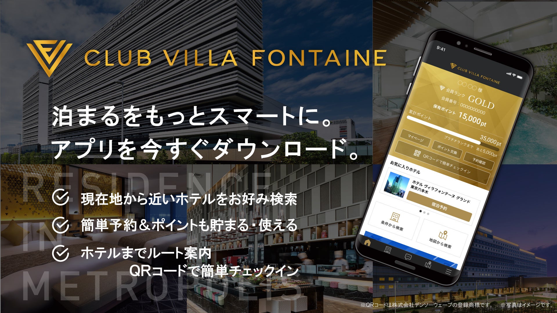 CLUB VILLA FONTAINE公式アプリが本日より大幅にバージョンアップ。アプリのダウンロードやバージョンアップを行っていただいたお客様にはもれなくご宿泊予約で使える500円割引クーポンをアプリ上で配布いたします。