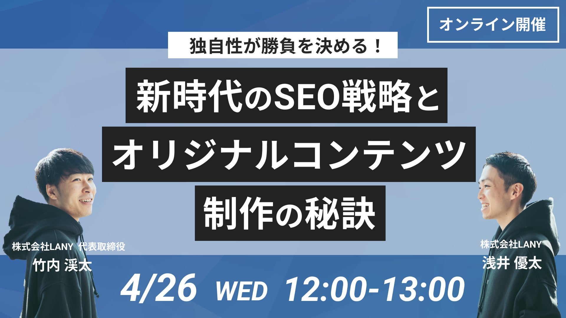 SEOコンサルティングサービスを提供する株式会社LANY(東京都渋谷区、代表取締役社長:竹内渓太)は、独自性が勝負を決める!新時代のSEO戦略とオリジナルコンテンツ制作の秘訣を解説するウェビナーを4/26(水)に開催いたします。