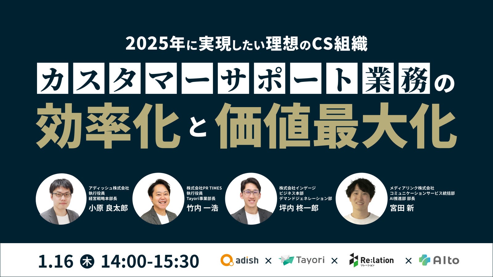 カスタマーサポートを自動化するAIエージェント「AIto(アイト)」を提供するメディアリンク株式会社(本社:東京都港区、代表取締役:松本 淳志)は、アディッシュ株式会社(本社:東京都品川区、代表取締役:江戸 浩樹)、株式会社PR TIMES(本社:東京都港区、代表取締役:山口 拓己)、株式会社インゲージ(本社:東京都新宿区、代表取締役 CEO:和田 哲也)ともに、2025年1月16日(木)14時より4社共催の無料オンラインセミナーを開催します。