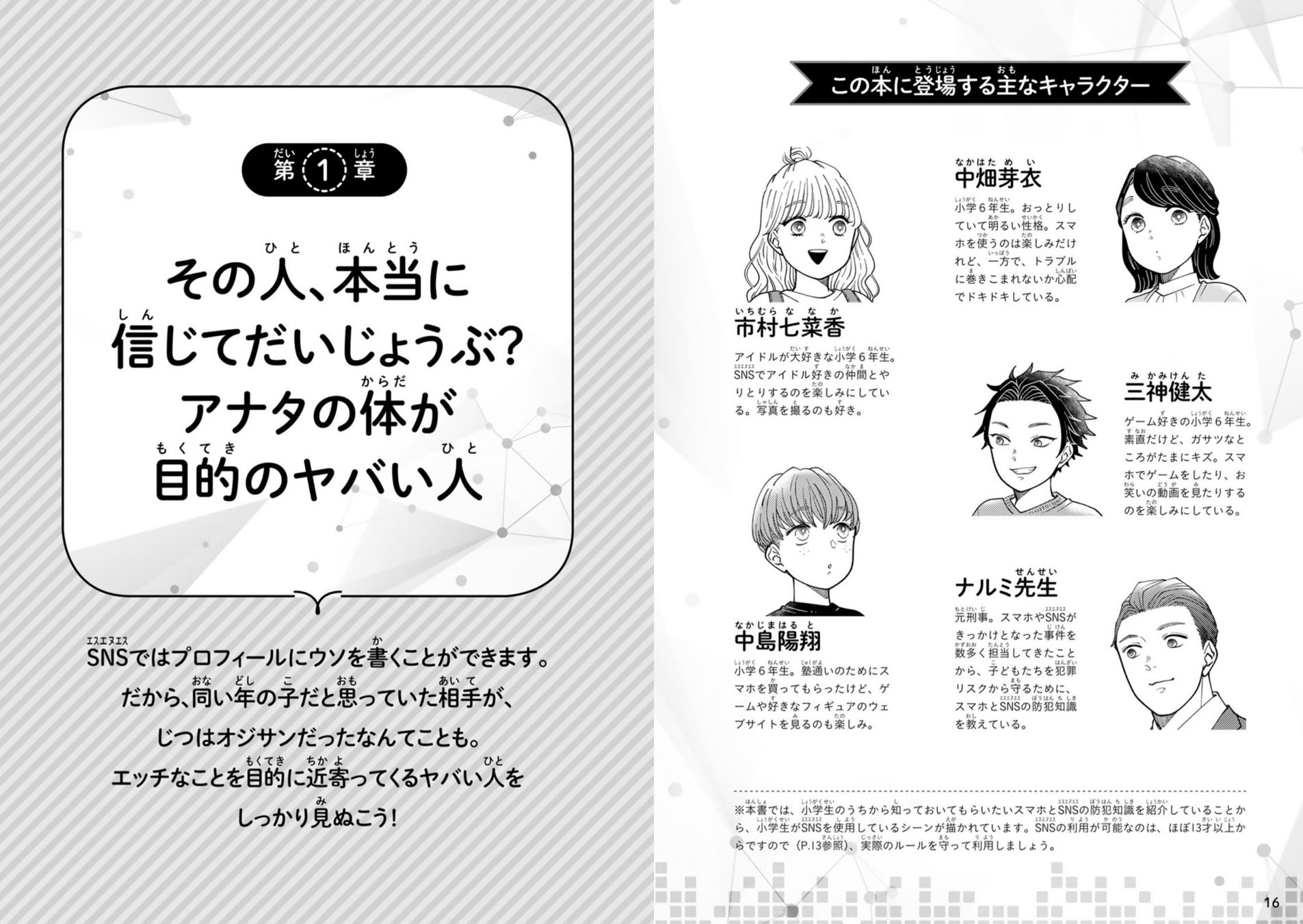 スマホやSNSはとても便利で、私たちの生活に欠かせないツールです。裏を返せば、それは悪ことを企んでいる人にとっても便利なアイテムであるということ。本書を通して、スマホとSNSを正しく怖がり、正しく使えるよう、ルールを学んでいきましょう。