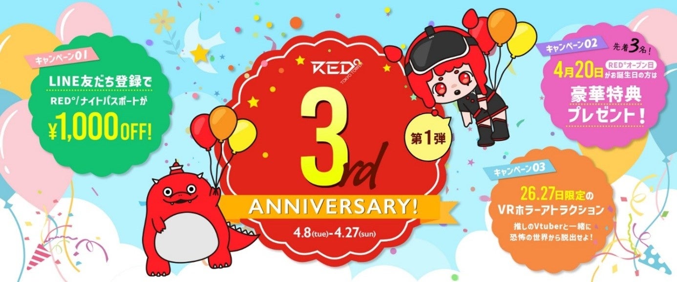 東京タワーを拠点に、アニメ、漫画、ゲーム、スポーツなどIPとファンとのマッチング事業を展開するTEG株式会社(本社:東京都港区、代表取締役社長:原 康雄 以下、TEG)が運営する、日本最大級のデジタルアミューズメントパーク「RED° TOKYO TOWER」は2025年4月20日(日)に開業3周年を迎えます。