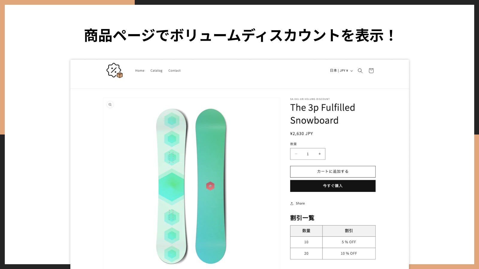 「シンプルボリュームディスカウント|お手軽まとめ買い割引」では、 商品ページでボリュームディスカウントを表示できます。