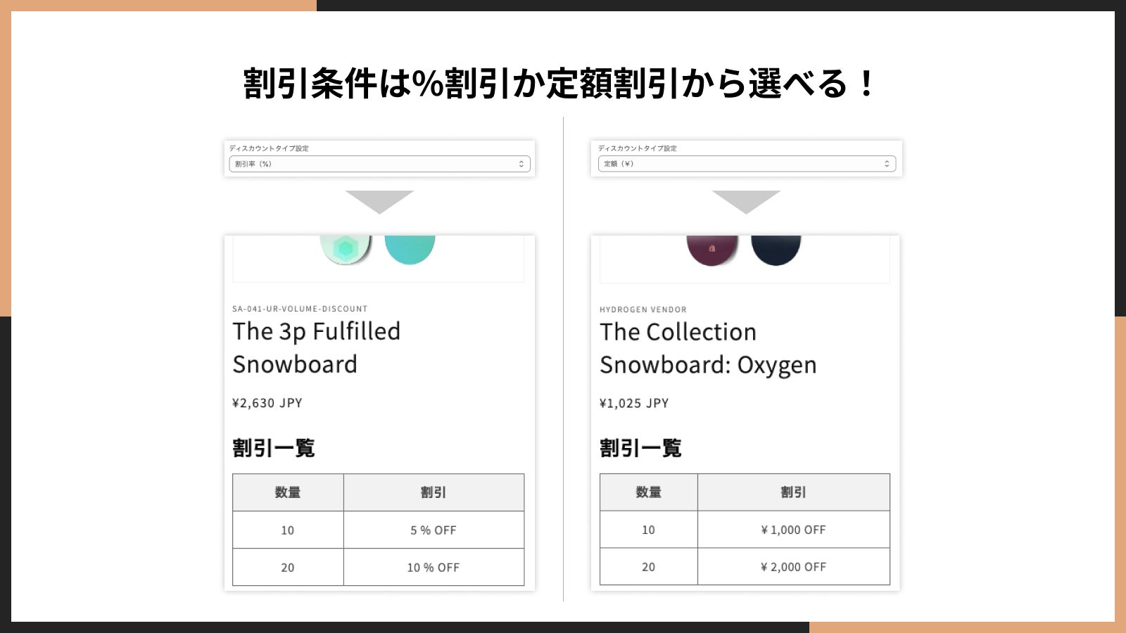 「シンプルボリュームディスカウント|お手軽まとめ買い割引」では、割引条件を%割引か定額割引から選べます。