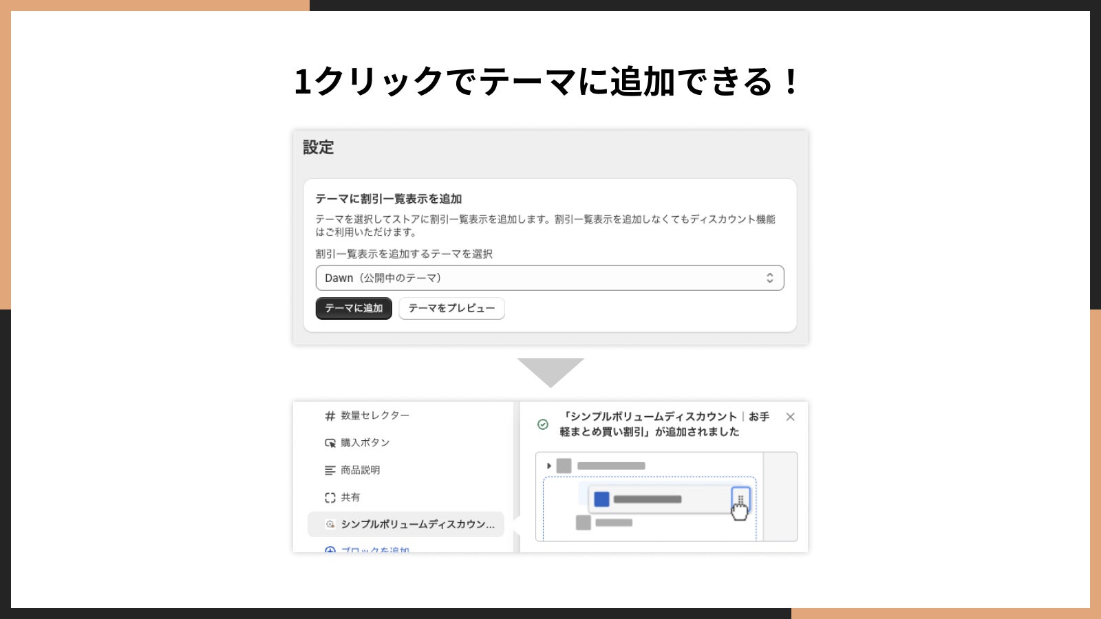 「シンプルボリュームディスカウント|お手軽まとめ買い割引」では、1クリックでテーマに追加できます。