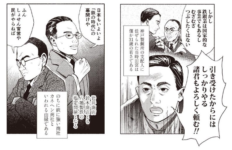 岩井商店の岩井勝次郎は、欧米諸国への外遊後に、洋服にビジネスの可能性を見出し、メリヤス製造事業(現・トーア紡コーポレーション)の経営に参画。官営八幡製鉄所が稼働すると、鈴木商店の金子直吉は「国がやるべきことを鈴木がやる」との勢いで、神戸製鋼所を設立する。一方、岩井商店の岩井勝次郎も日本最古の鉄鋼輸入商社として、亜鉛鉄板事業の育成を決意し、大阪鉄板製造(後の日新製鋼、現・日本製鉄)を設立し、自ら社長に就任する。