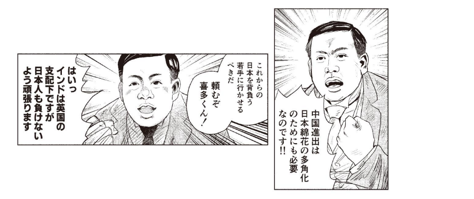 第二代社長の田中市兵衛は、入社二年目で19才の喜多又蔵を当時まだ日本人がほとんどいなかったインドのボンベイに派遣する。喜多又蔵は、その後中国を視察し、中国を綿花調達拠点だけでなく、市場としての重要性に着目し、上海支店設立を提言。喜多又蔵は、さらに最大の綿花栽培地でもある米国に社員を派遣する。
