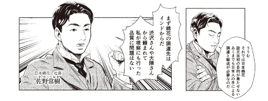 一方の日本綿花初代社長の佐野常樹は、海外綿花の調達を試みるが、輸送を外国船籍に依存しなければならない現状に苛立ち、渋沢栄一や他の紡績会社に働きかけ、日本郵船による日印定期航路を開通させる。