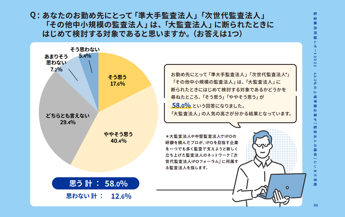 - 準大手や中小規模の監査法人は「大監査法人に断られた時に初めて検討する」58.0%