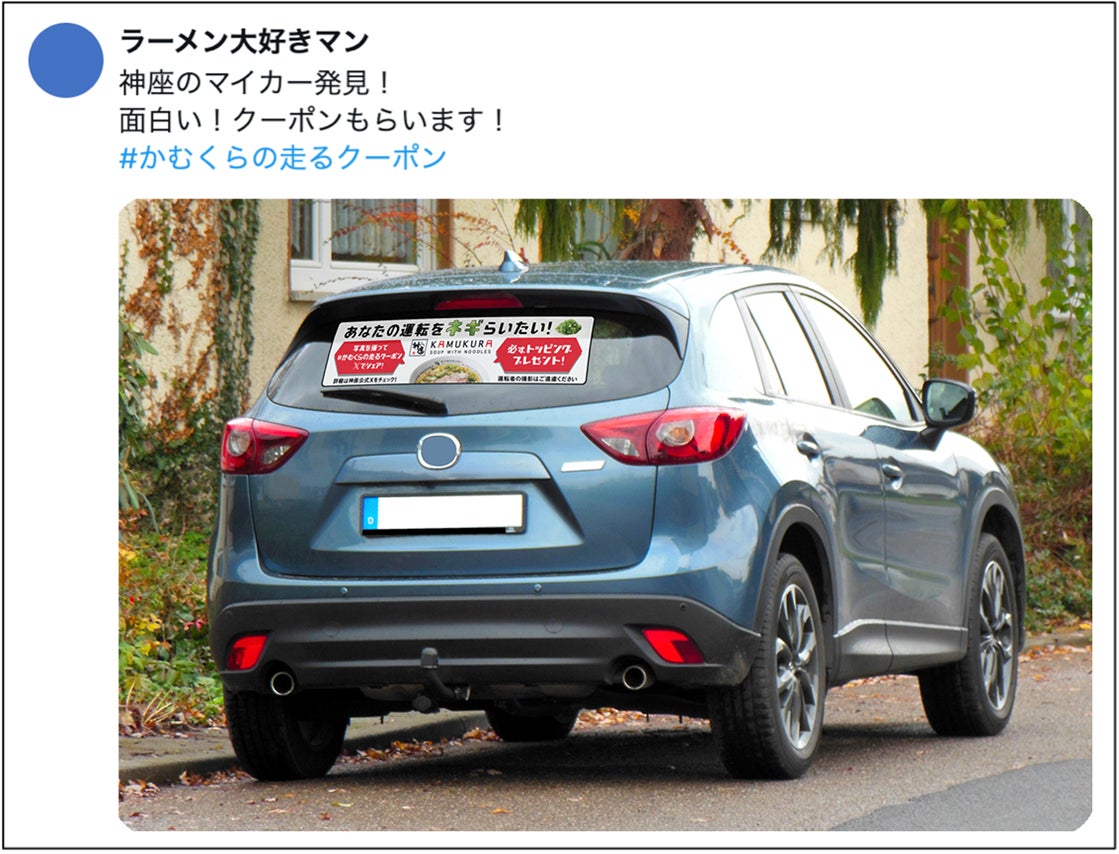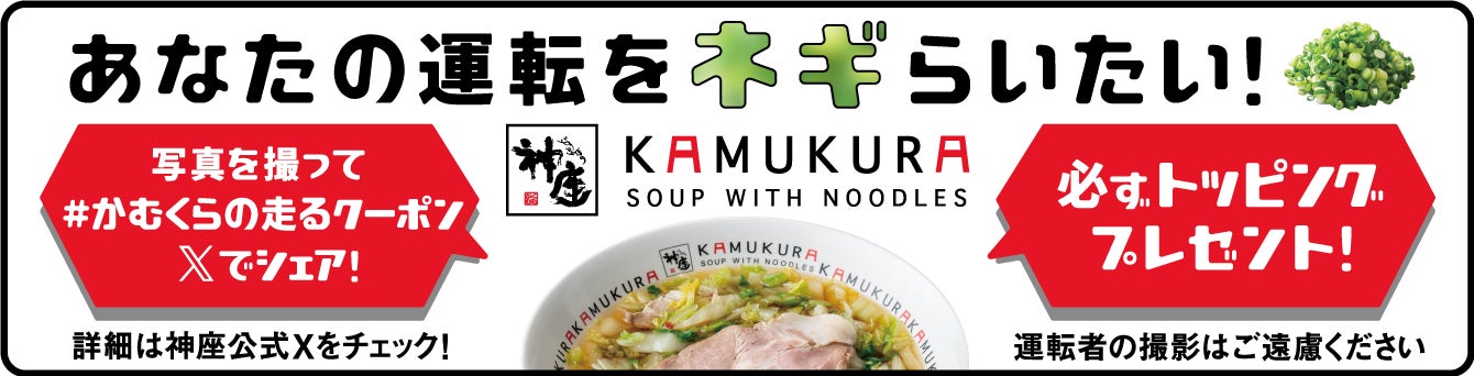 当キャンペーンの広告ステッカーが貼られた車両を撮影し、ハッシュタグ「#かむくらの走るクーポン」と撮影写真を添付した状態でX(旧:Twitter)に投稿された方全員にトッピング無料券(150円までのトッピング)をプレゼント!