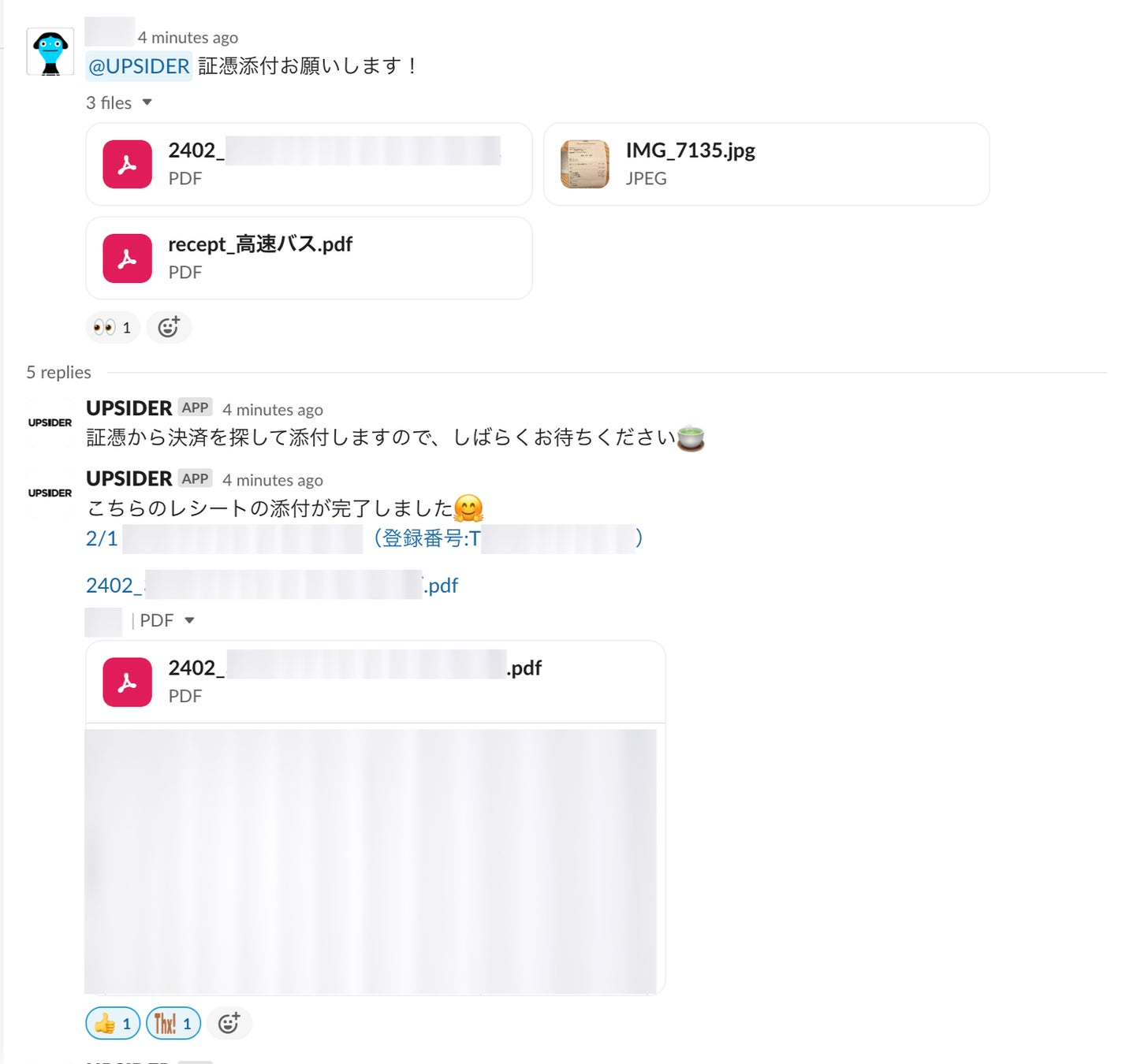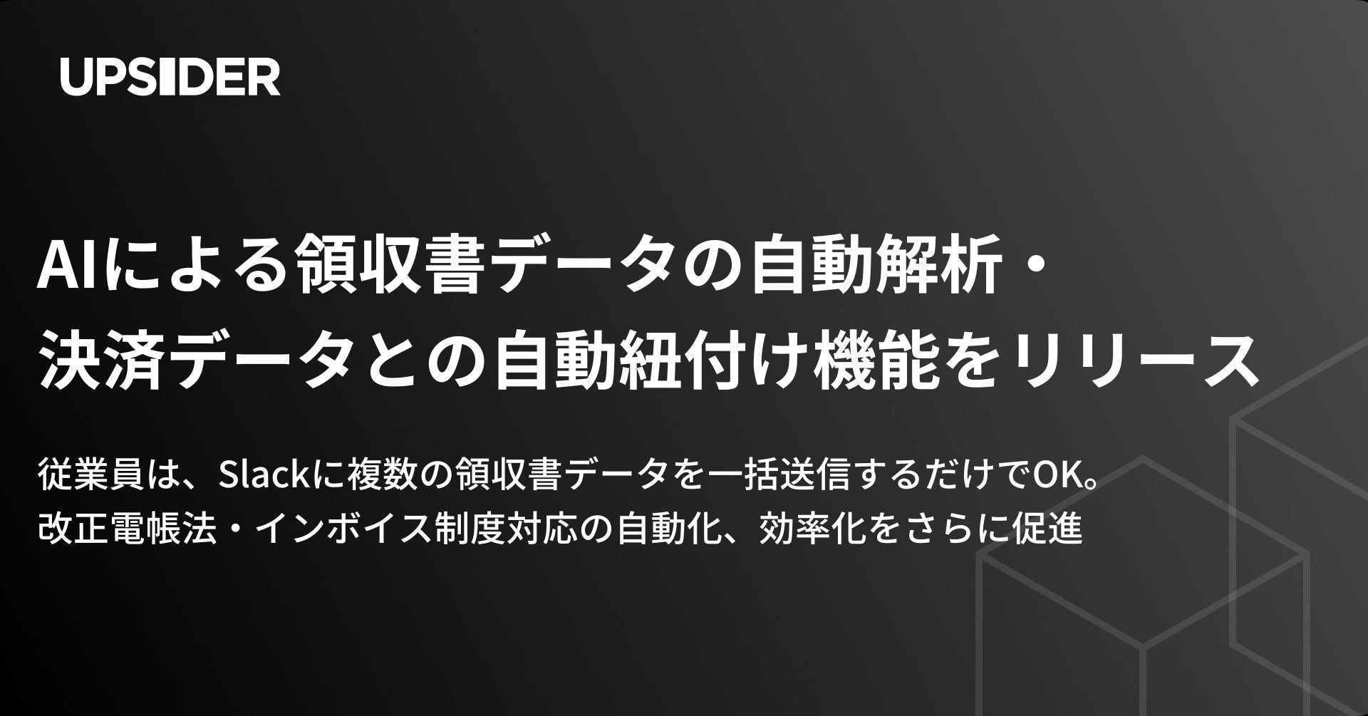 「挑戦者を支える世界的な金融プラットフォームを創る」をミッションに、法人カード「UPSIDER」(以下、UPSIDER)をはじめとする金融サービスを提供する株式会社UPSIDER(代表取締役:宮城徹・水野智規、本社:東京都港区、以下 当社)は、UPSIDER利用企業の従業員がSlackに1枚〜複数枚の領収書を添付した際、AIが自動解析・UPSIDERの決済データに自動紐付けする「証憑自動紐付け機能」(以下、本機能)をリリースいたしました。本機能は、企業の改正電子帳簿保存法(以下、電帳法)やインボイス制度への対応業務負担を軽減するためのもので、すべてのUPSIDERユーザーに無料で提供いたします。