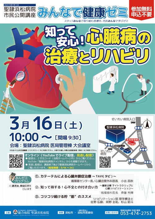 社会福祉法⼈聖隷福祉事業団 総合病院聖隷浜松病院(静岡県浜松市)は、市⺠公開講座 第3回みんなで健康ゼミ「知って安心!心臓病の治療とリハビリ」を開催します。心臓弁膜症ってどんな病気?どんな治療法があるの?など、わかりやすく解説します。