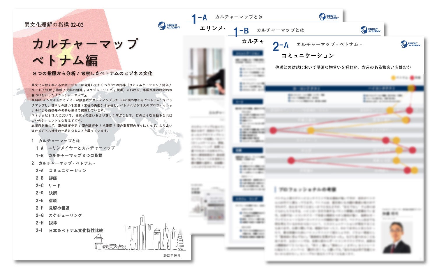 インサイトアカデミーでは、独自にプロッティングした30か国の中からこの度“ベトナム”をピックアップし、8つの指標を説明するとともに、日本との違いを定量 / 定性の両面から分析し、ベトナムビジネスのプロフェッショナルによる8つの指標毎の考察を盛り込んだ「国別カルチャーマップ ベトナム編」をリリースいたしました。