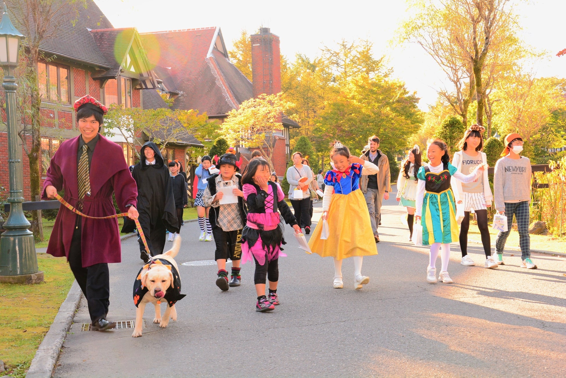 おばけや魔女に変装して外国人教員と中世英国の街並みを練り歩きます。英語で合言葉を唱えるとお菓子がもらえます。