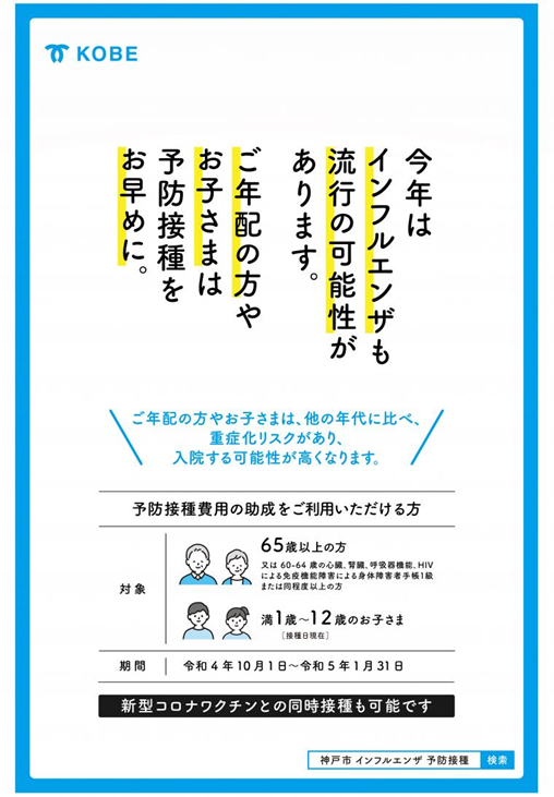 今冬は、新型コロナウイルス感染症との同時流行に備え、重症化を防止し、病床の逼迫を防ぐためにも、早期に接種を受けていただきたいと考えており、神戸市は様々な呼びかけを行っていきます。