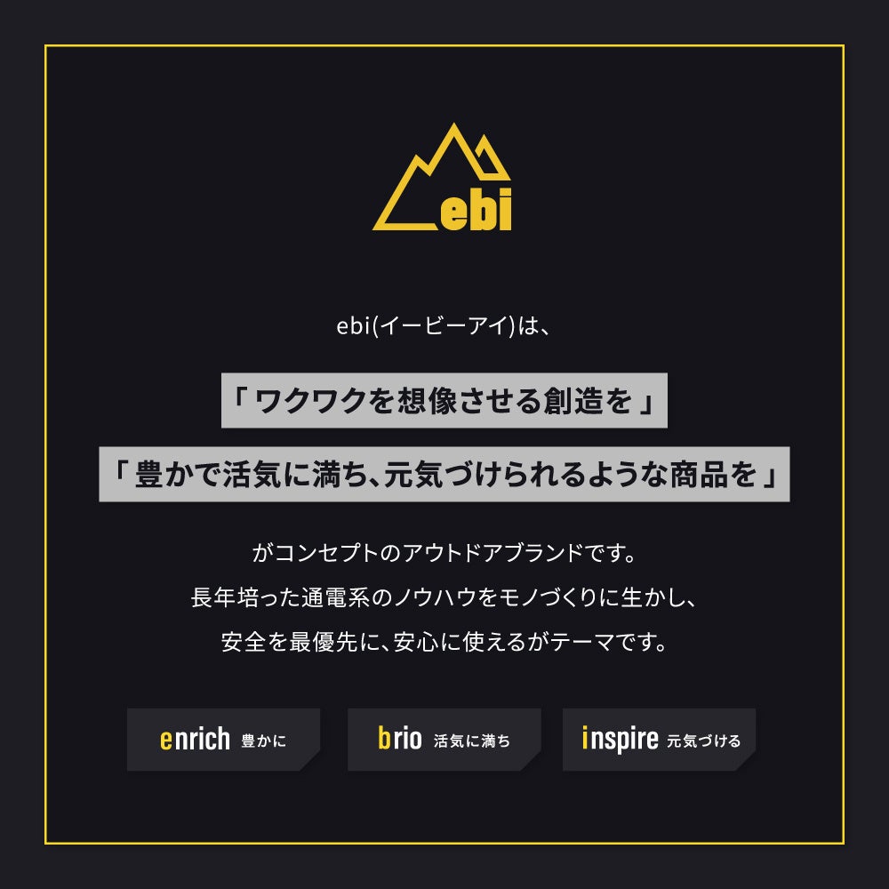 オウルテックのアウトドア新ブランドは、e:enrich「豊かに」、b:brio「活気に満ち」、i:inspire「元気づける」の頭文字を取り、ブランドネーム「ebi(イービーアイ)」として「豊かで活気に満ち、元気づけられるような商品を」をコンセプトにしています。