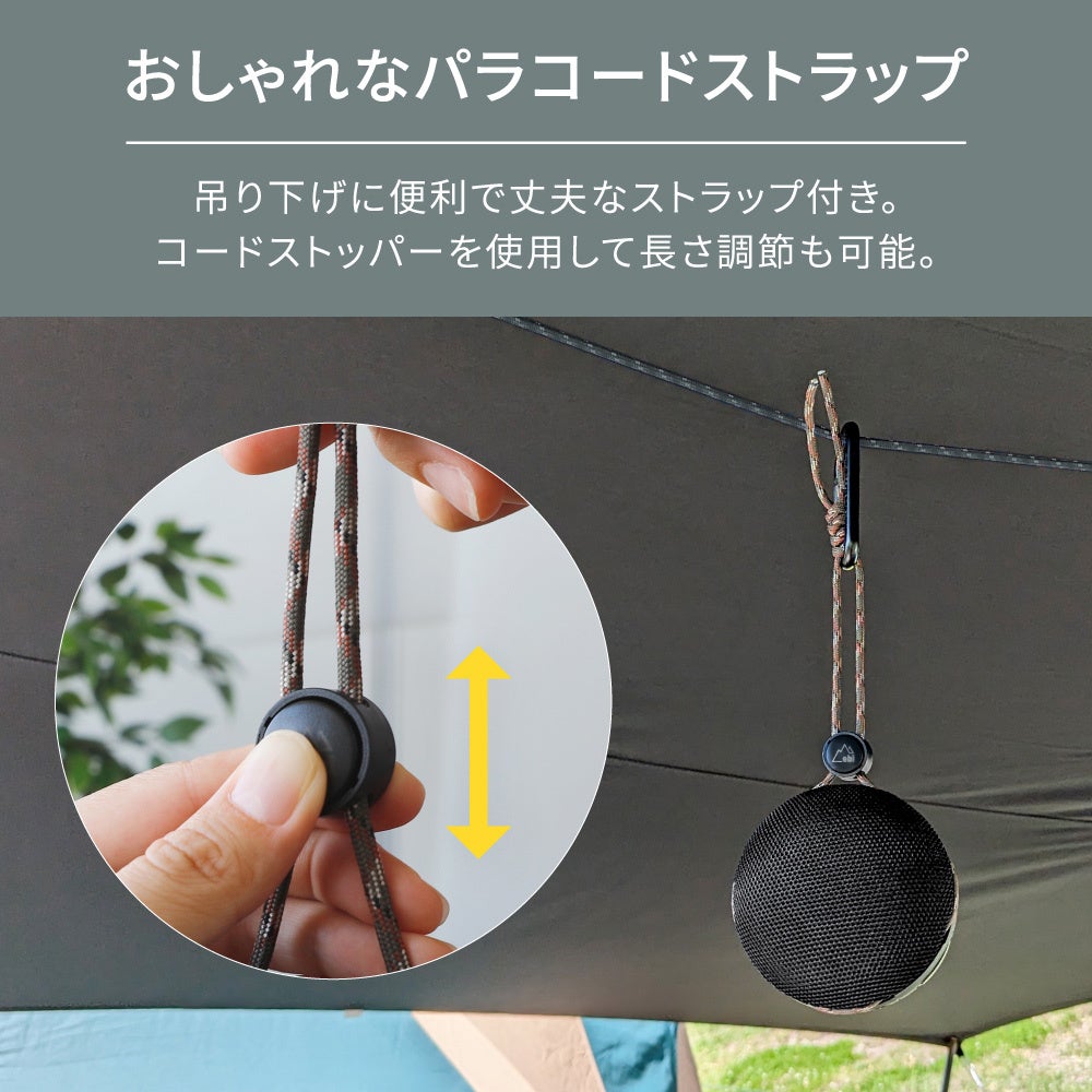 コードストッパーを使用して長さ調節ができ、屋外利用ではタープやカラビナハンガーなどに吊り下げられるようになっています。