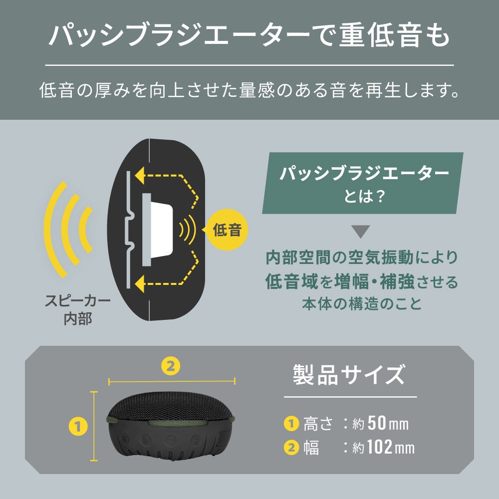 パッシブラジエーター仕様により、コンパクトな本体ながら低音の厚みを向上させた量感のある音を再生することができます。