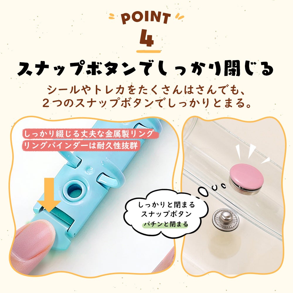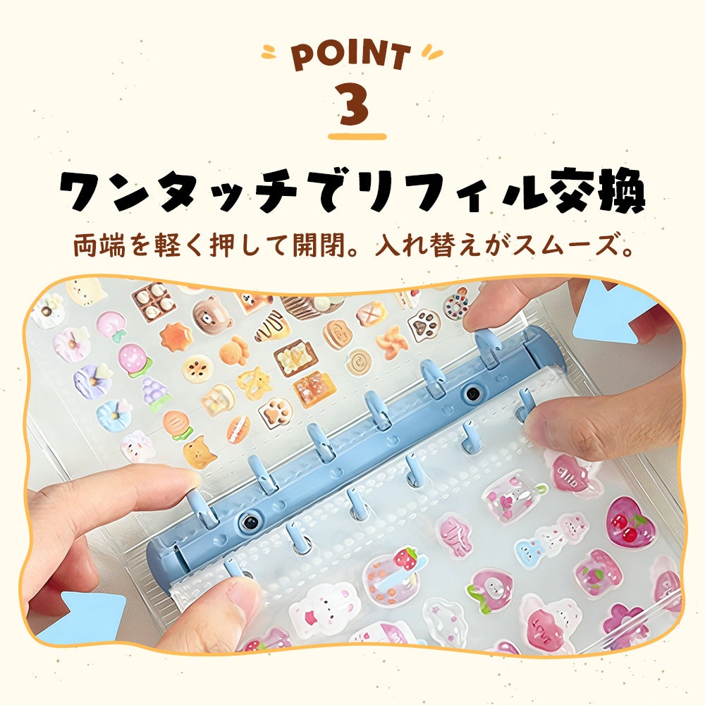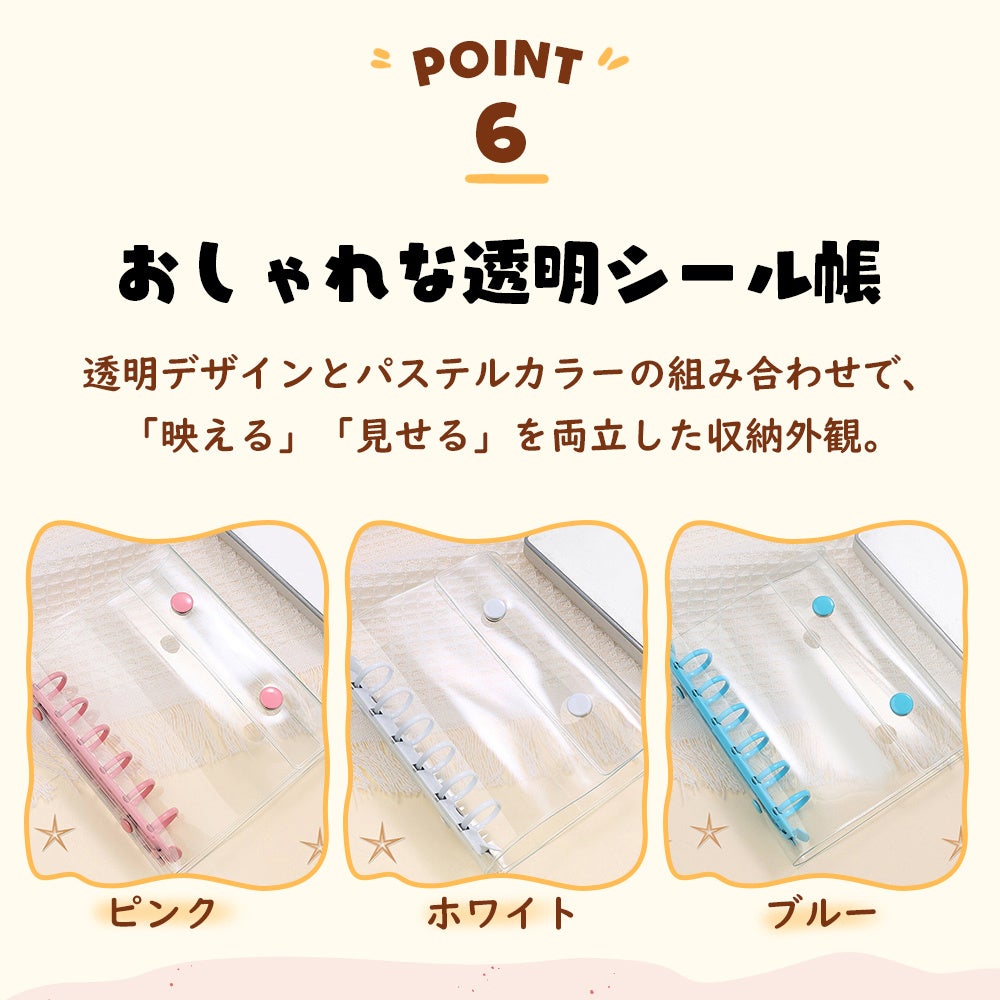 現在大流行中のシール収集や、推し活・トレカ収納など使い方自由自在。自由にカスタマイズして自分だけの1冊が作れる透明シール帳です。ホワイト、ピンク、ブルーの3色のバインダーをご用意。