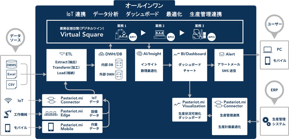 投資に対して十分な効果のある製造業DXを実現するには、工場IoT(OT)と生産管理(IT)をリアルタイムにつなぎ、全体の最適化を図ることが必要です。「Pasteriot.mi」は、IoTデータ・生産管理データの連携インタフェースを備えているため、OTとITの両データをリアルタイムに取込み可能です。生産管理システムを通して得られたインサイトを現実業務にフィードバックし、改善されたデータを再びIoTデータとして取り込むことで、製造プロセス全体における自律的な改善サイクルを生み出します。