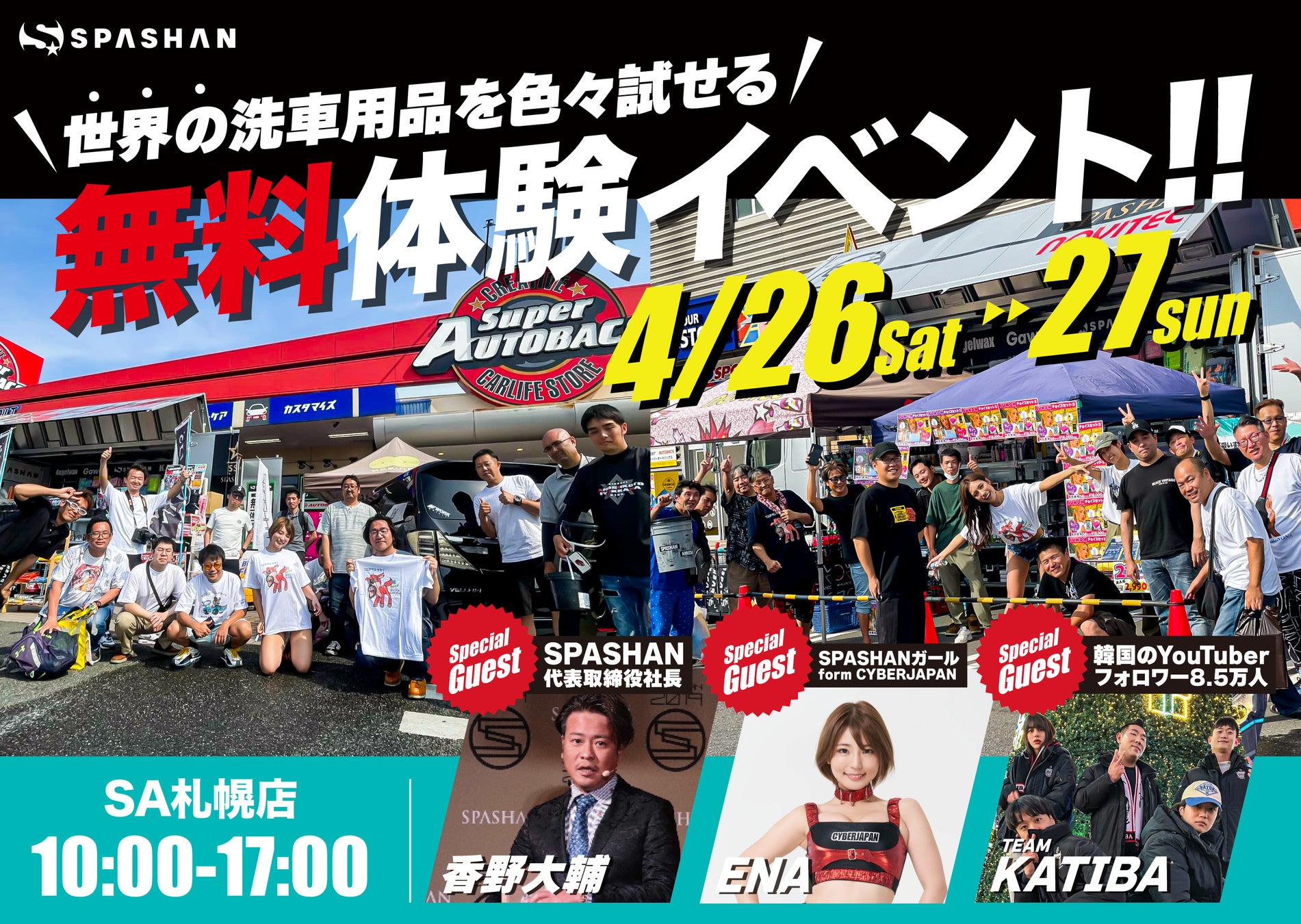 オリジナルカーケアブランドSPASHANを展開する株式会社HOBSTAR(本社:神戸市東灘区)は4月26日、27日の2日間、スーパーオートバックス 札幌店(北海道)にて、大人気カーコーティング『SPASHAN』をはじめ、取り扱いを行う製品の無料体験会を開催いたします。当日は、専門のディテール職人と本社スタッフが気合を入れて参加します!世界トップクラスの技と技術の披露はもちろん、磨き方や洗車の正しい方法・効率の良い洗車法などレクチャーさせて頂きます!しっかり丁寧に教えてもらえるDIY講習ありで、愛車をピカピカチャレンジしてみましょう!