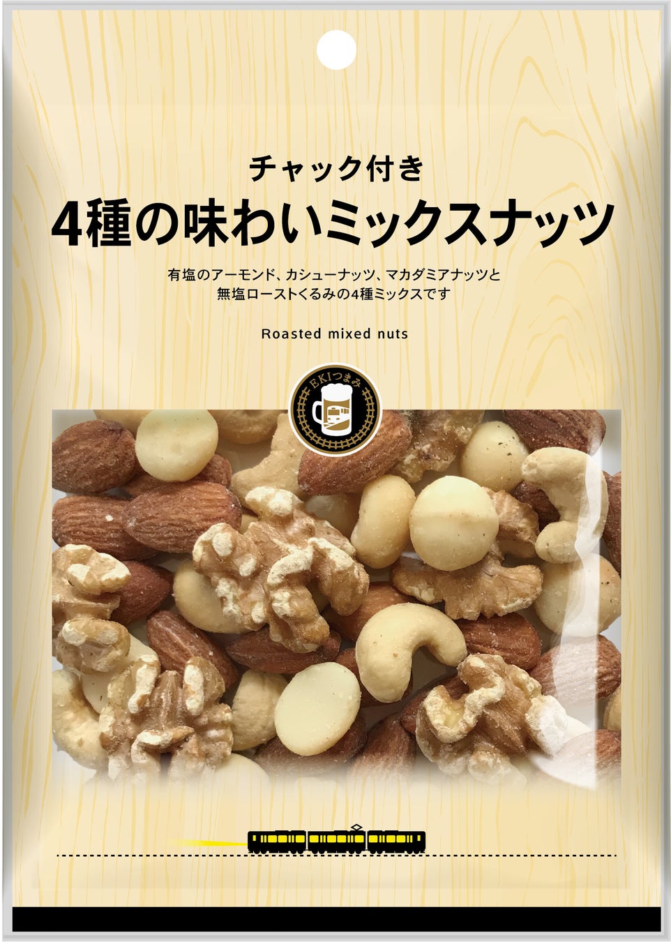 有塩のアーモンド、カシューナッツ、マカダミアナッツと無塩ローストくるみの4種ミックスです。チャック付きで持ち歩きにも便利です。