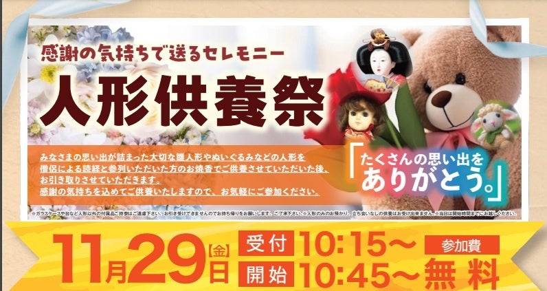 大切な思い出に感謝を込めて—ベルコ 人形供養祭を11月29日シティホール東大阪で開催