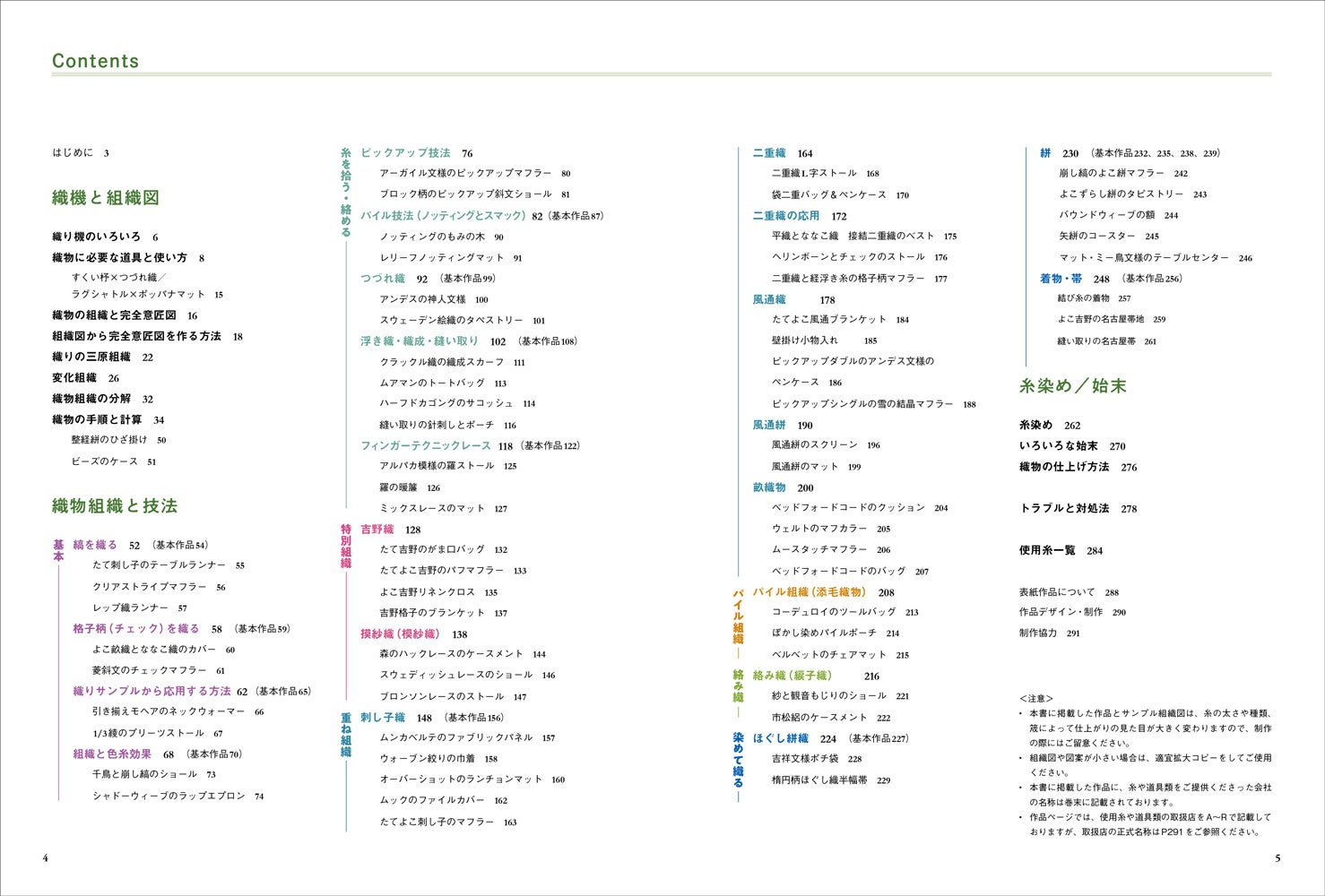 <織物組織と技法> 縞を織る/格子柄(チェック)を織る/織りサンプルから応用する方法/組織と色糸効果/ピックアップ技法/パイル技法(ノッティングとスマック)/つづれ織/浮き織・織成・縫い取り/フィンガーテクニックレース /吉野織/摸紗織(模紗織)/刺し子織/二重織/二重織の応用/風通織/風通絣/畝織物/パイル組織(添毛織物)/絡み織(綟子織)/ほぐし絣織/絣/着物・帯