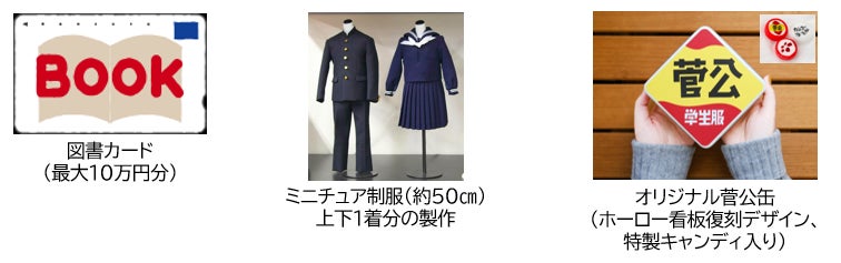 ・最優秀賞(1名):図書カード10万円分+ミニチュア制服上下1着分作製+オリジナル菅公缶