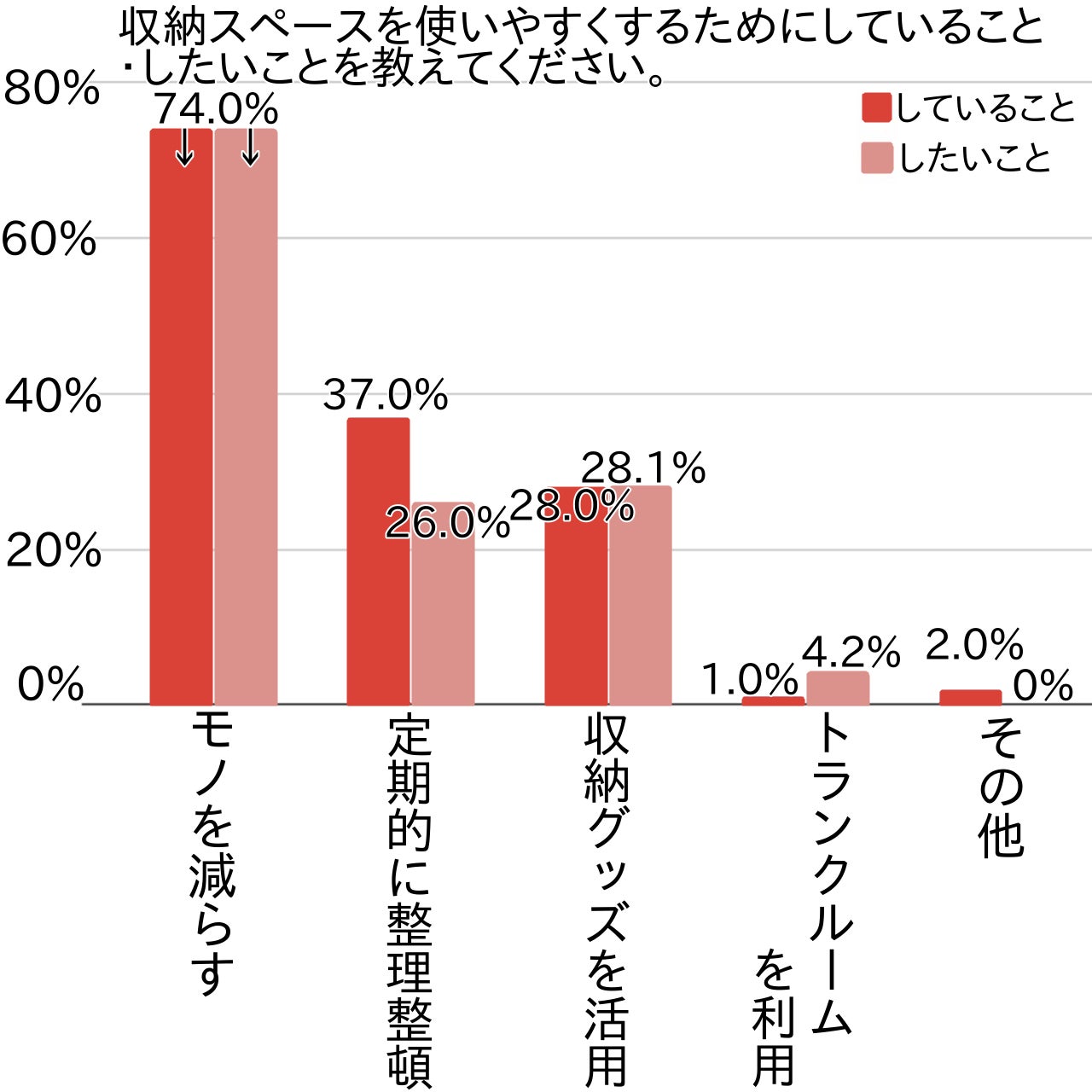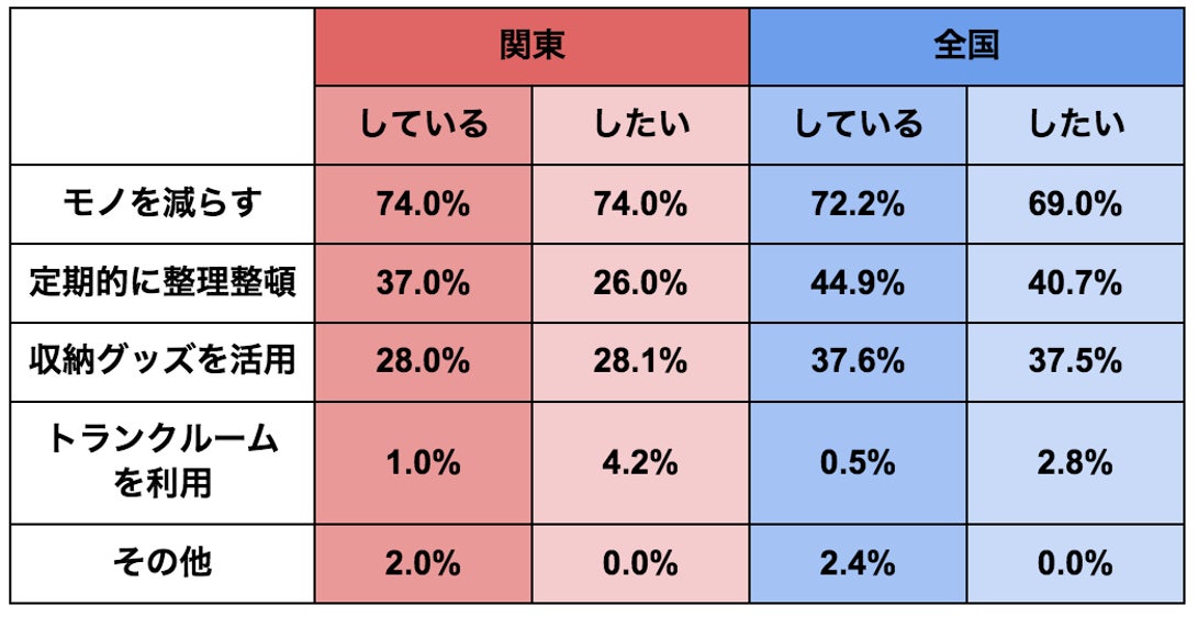 関東・全国とも順位は同じで、まず「モノを減らす」ことで必要最低限のモノの量にし、「定期的に整理整頓」して不要になったもののチェックも行うという方針の方が多いようです。また、収納力を上げるために「収納グッズを活用」したり、収納スペースをより広く確保するため「トランクルームを利用」したいと考えている方も見受けられました。