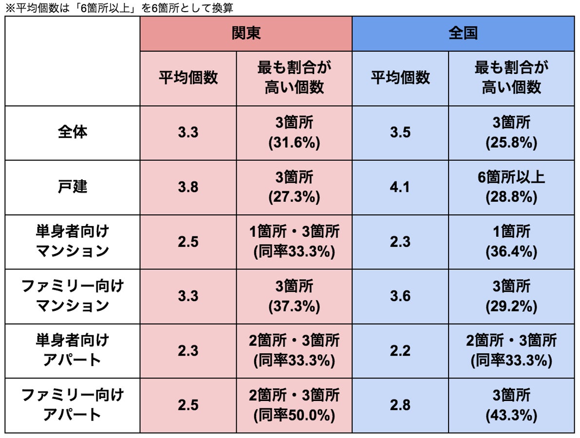 各住宅タイプでは、単身者向けマンション(関東2.5・全国2.3)と単身者向けアパート(関東2.3・全国2.2)を除く全てのタイプで関東が全国より平均個数が下回っていました。
