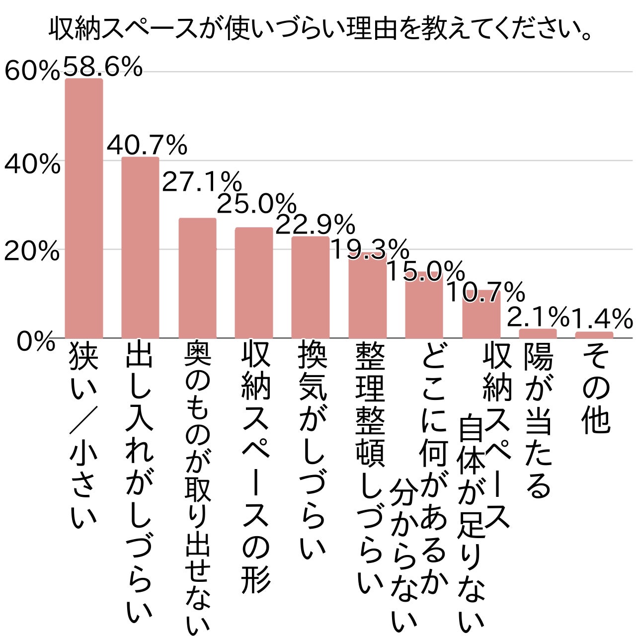 収納スペースの間口の狭さなど形状の問題も多少はあるものの、主には収納物がいっぱいで目的物を出し入れしづらいというケースが多いようです。