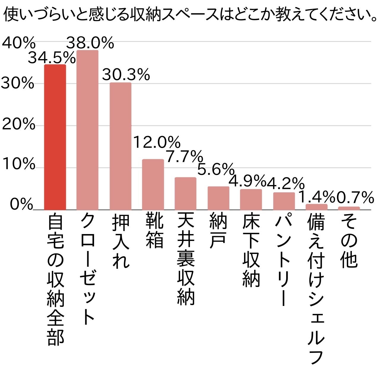 まず、「自宅の収納全部」が使いづらいと答えた方は関東で約3割(34.5%)・全国で約2割(20.1%)でした。
