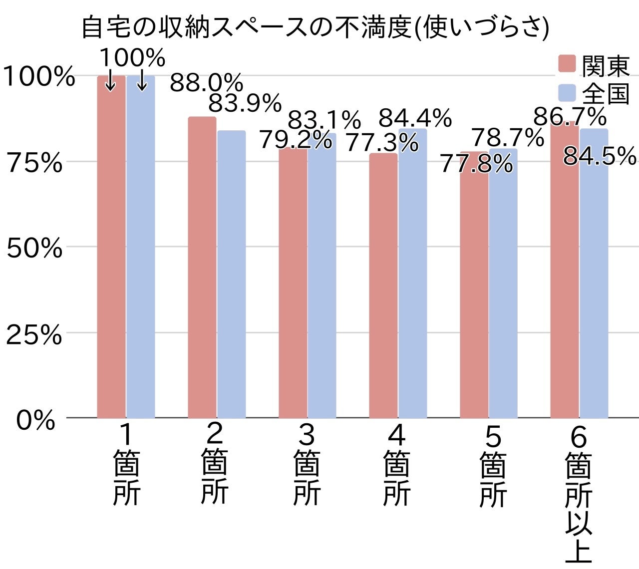 また、収納スペースが2箇所以上、個数増加に伴い不満度は若干の減少傾向があり、関東では4箇所・全国では5箇所で不満度が最も低かったものの、6箇所以上になるとまた不満度が上昇していました(関東86.7%・全国84.5%)。