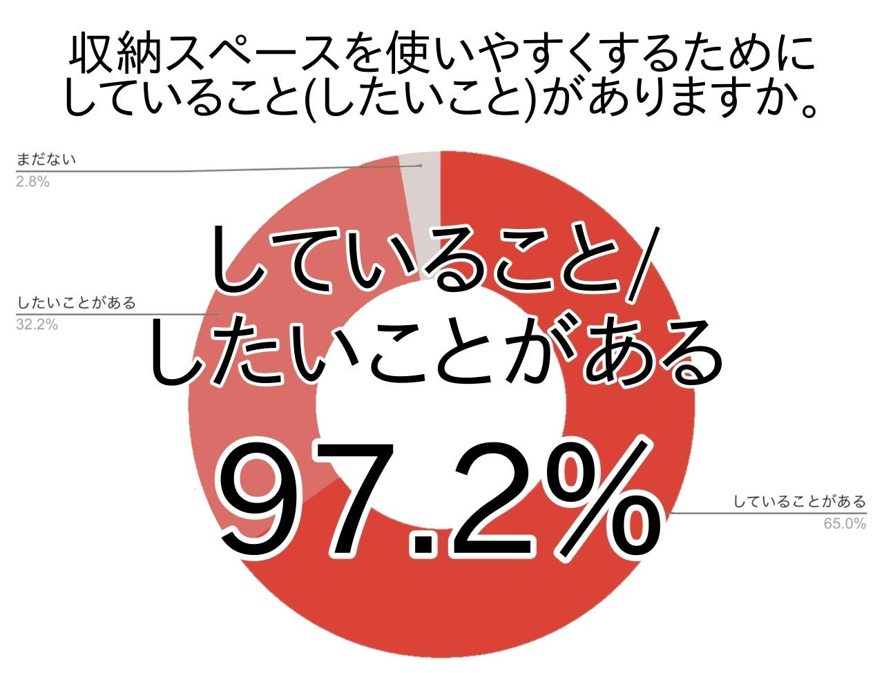 アンケートでは収納スペースを使いやすくするためにしていることやしたいことがあると答えた方は関東で10割弱(97.2%)・全国で約9割(93.0%)でした。