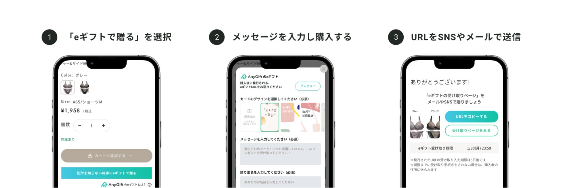今回、当社のAnyGiftの提供により、「247lingerie 公式オンラインストア」にて全ての商品がeギフトとして贈れるようになります。プレゼントとして難易度が高いといわれていた下着ですが、サイズや届け先は受け取り側が指定できるため、気軽にギフトを贈ることができます。