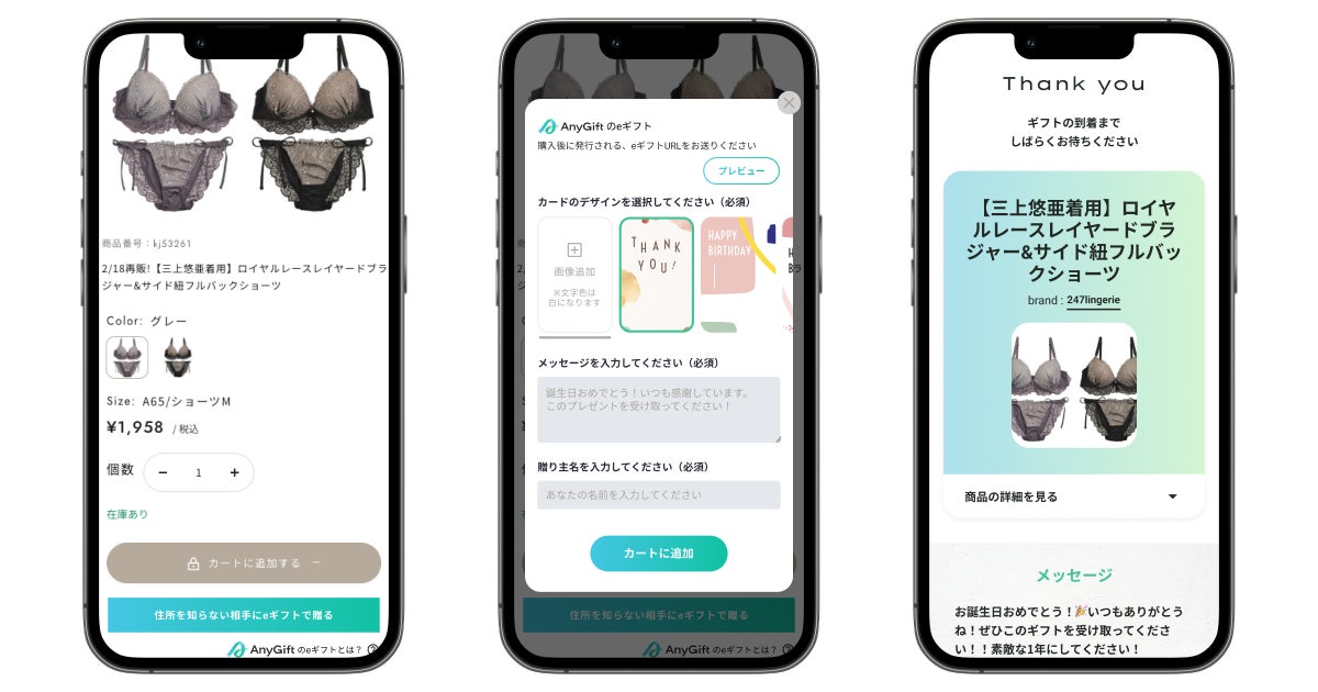 そこでこの度、お客様にもっと気軽に247lingerieの商品をプレゼントとしてご利用いただきたいという思いから、AnyGiftの導入を決定いたしました。