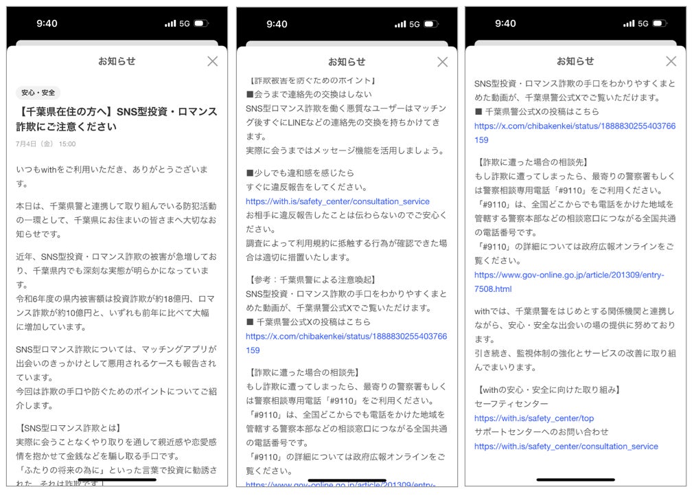 マッチングアプリ「with」「Omiai」の運営統括を行うエニトグループ、SNS型投資・ロマンス詐欺対策の一環として千葉県警察と連携し、ユーザーを対象に注意喚起を実施