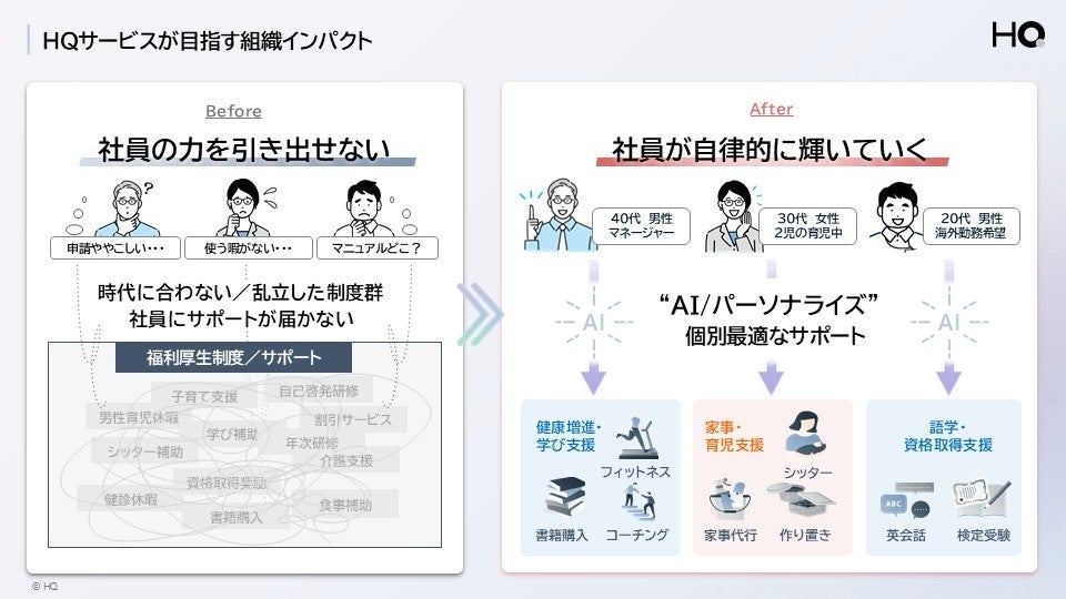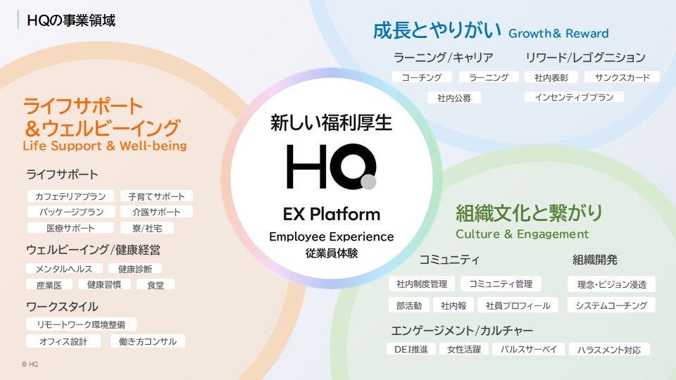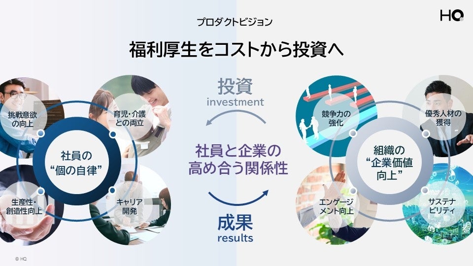HQは、新しい時代のニーズにあわせて、「福利厚生をコストから投資へ」を実現するEXプラットフォームへと進化し、「社員が自律的に輝く」世界観を実現してまいります。