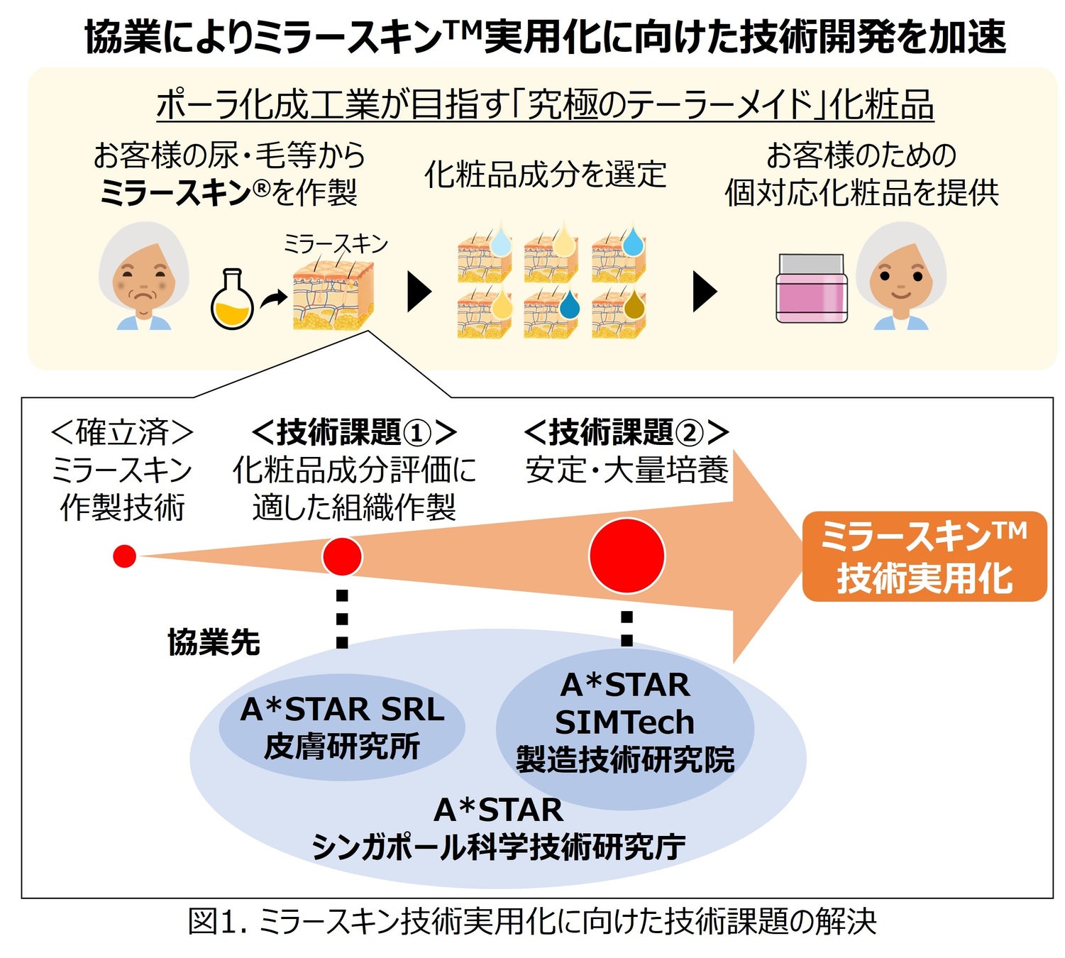 「究極のテーラーメイド」化粧品の実現に向けたミラースキン技術の実用化においては、大きく2つの技術進化が必要です。1つは、「より化粧品成分評価に適した組織に改良すること」、もう1つは、「品質の揃ったミラースキンを大量に培養すること」です。そこで、実用化研究を担うシンガポール拠点にて、シンガポール科学技術研究庁(A*STAR、補足資料1)の研究機関と協業し、これらの技術進化のための研究をそれぞれ本格スタートしました。