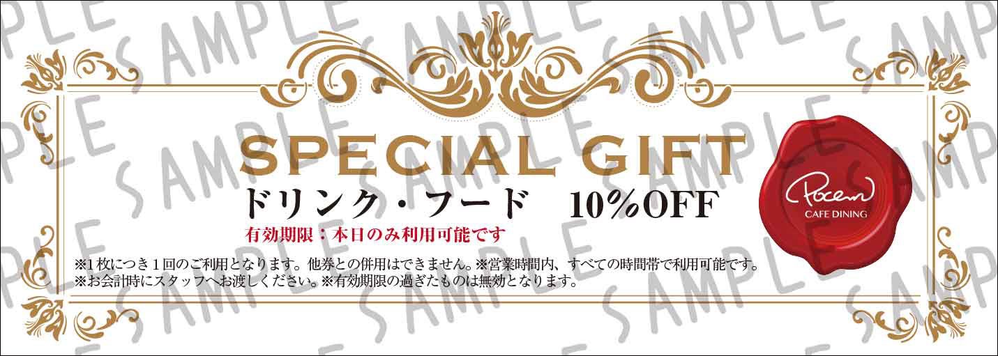 「Pocem Cafe Dining」で使える10%OFFクーポンを2種プレゼント! 当日限定クーポンと、後日から使えるクーポンをご用意しています。