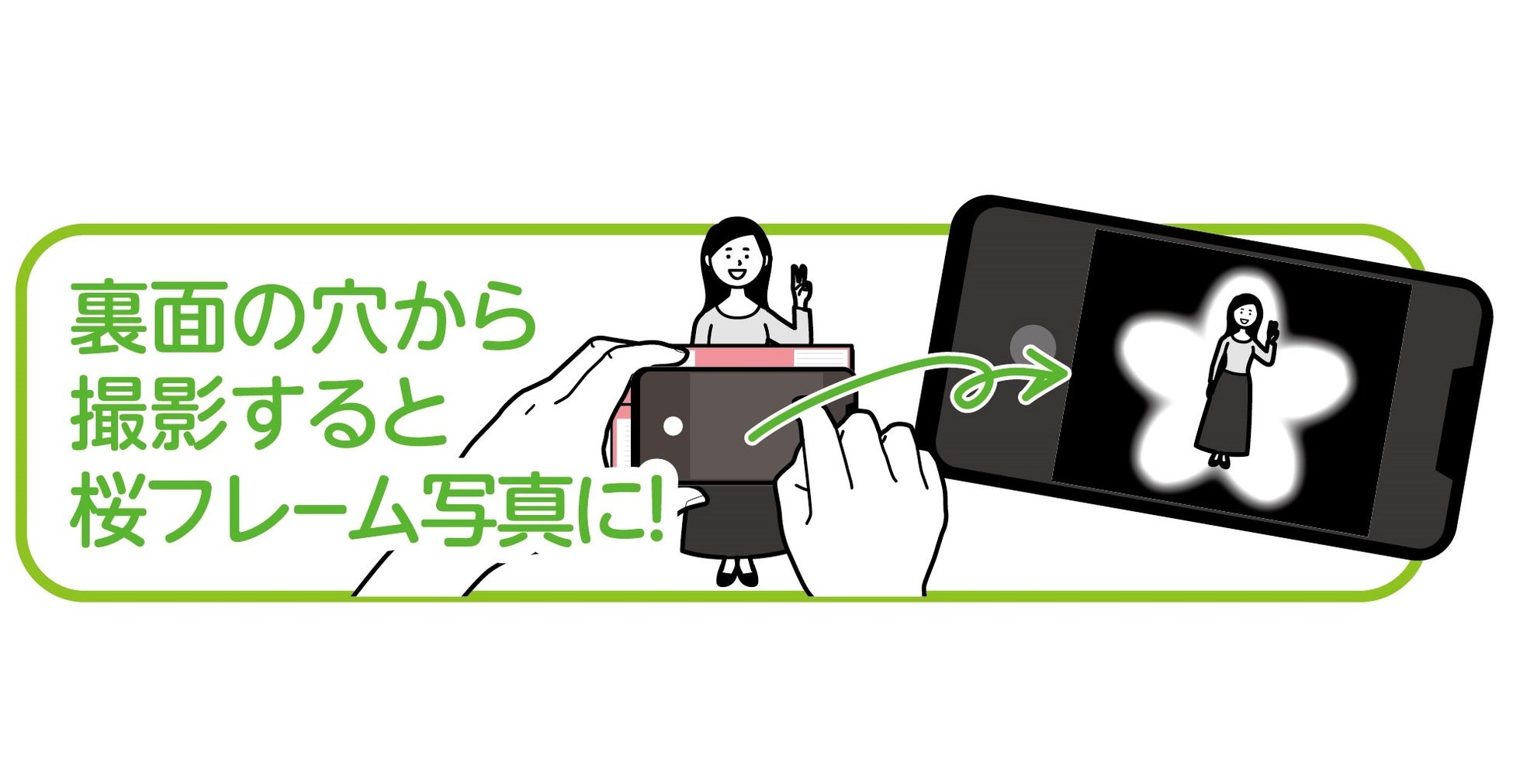パッケージ表面の「桜マーク」と裏面の「きりとる」マークを切り抜き、裏側からスマホなどのカメラを当てて撮影すると、桜フレームの写真が撮影できます。